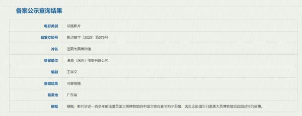 9月15日,国家电影局网站发布《关于2023年8月上全国电影剧本(梗概)备案、立项公示的通知》。其中,由漫恩(深圳)电影有限公司申报备案的动画影片《逃离大英博物馆》已获同意拍摄,其备案立项号为“影动备字〔2023〕第076号”。