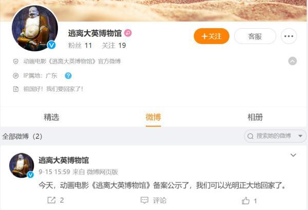 澎湃新闻注意到,认证信息为“动画电影《逃离大英博物馆》官方微博”的微博账号@逃离大英博物馆 已于9月13日上线,该微博账号15日也发布了动画电影《逃离大英博物馆》获备案公示的消息。