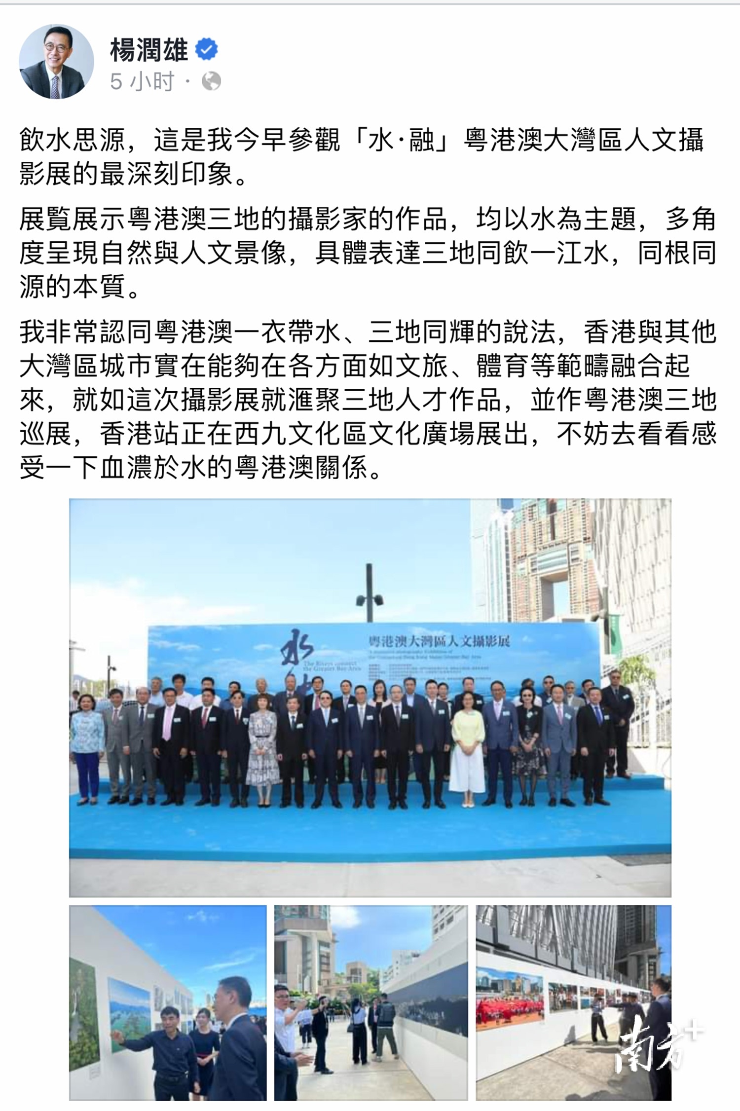 香港特别行政区政府文化体育及旅游局局长杨润雄“水·融”摄影展印象深刻,并在社交媒体上“安利”大家前去观展。