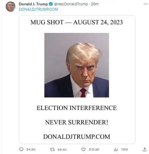 自首获释后,特朗普时隔两年半重返推特(现社交平台X),表明对此次指控的态度。