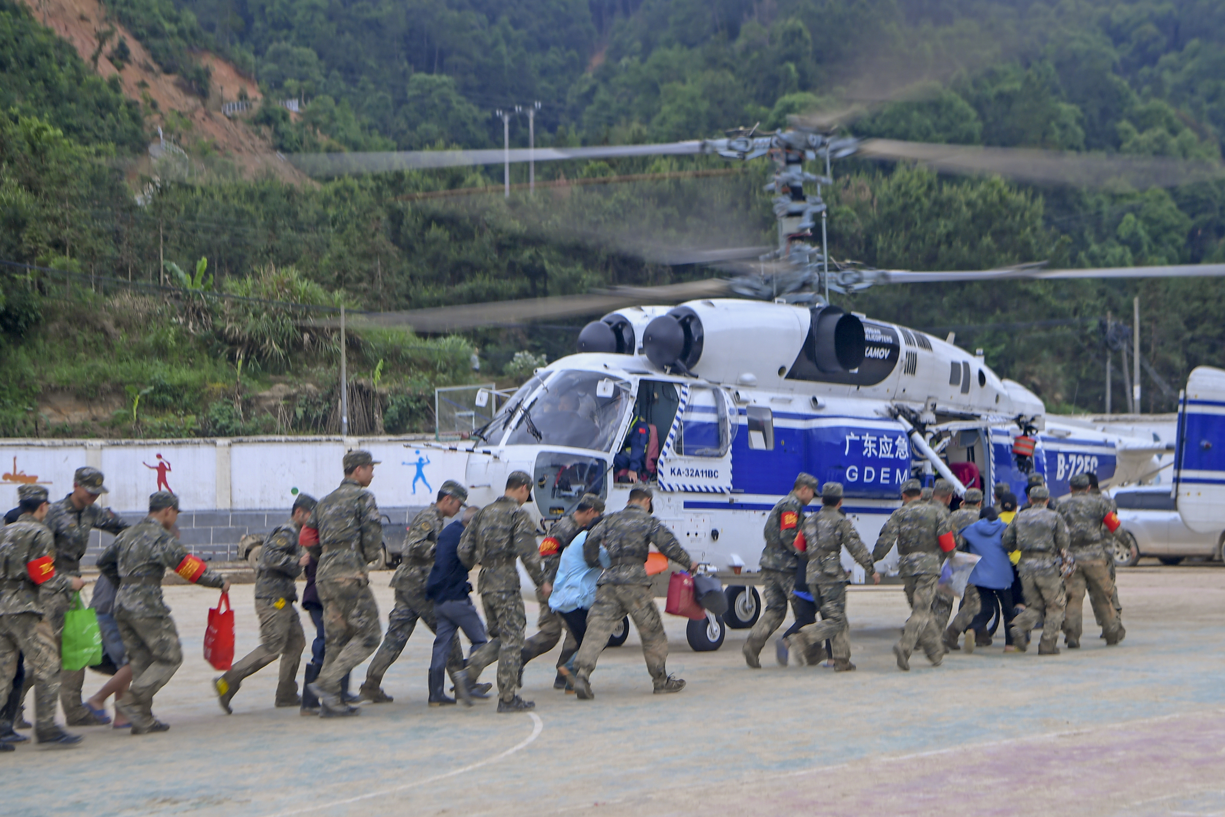 广东韶关江湾镇,4月22日,武警广东总队韶关支队官兵护送受灾群众登机,前往安全地域。