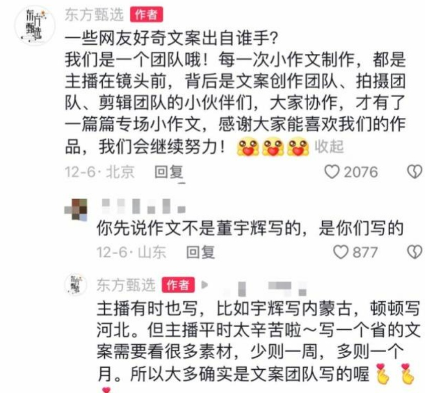 ●12月6日,东方甄选小编在东方甄选“吉林行”宣传视频下评论称,“每一次小作文制作,都是主播在镜头前,背后是文案创作团队、拍摄团队、剪辑团队的小伙伴们,大家协作,才有了一篇篇专场小作文。”