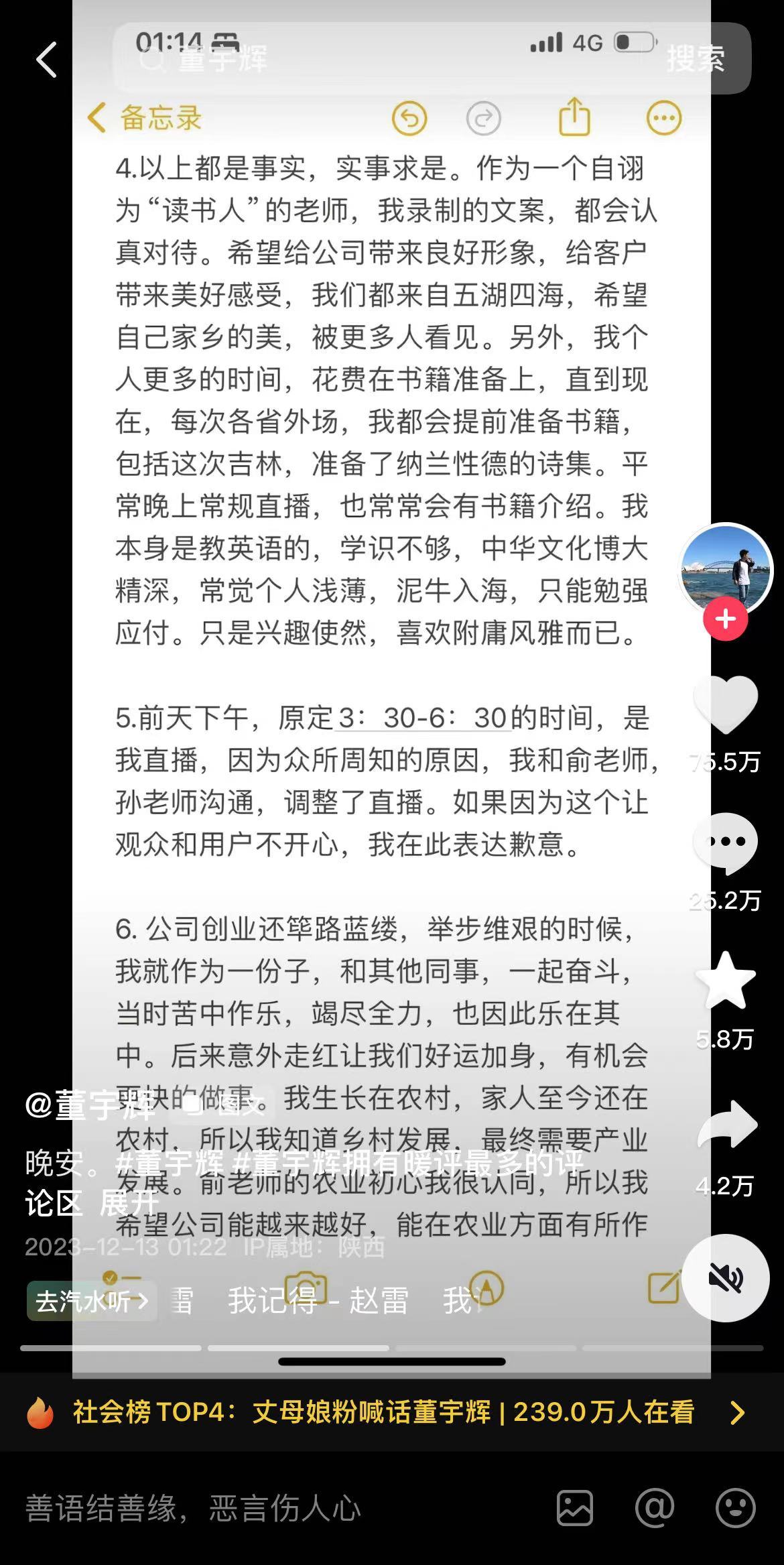 ●12月13日,董宇辉在个人账号发文回应近期“小作文”事件:省级专场的文案有自己写的;也有他提供思路和建议,小编录音记录并回去创作,后期讨论修改最终形成的;也有小编按照自己想法写的,呼吁大家理性发言。