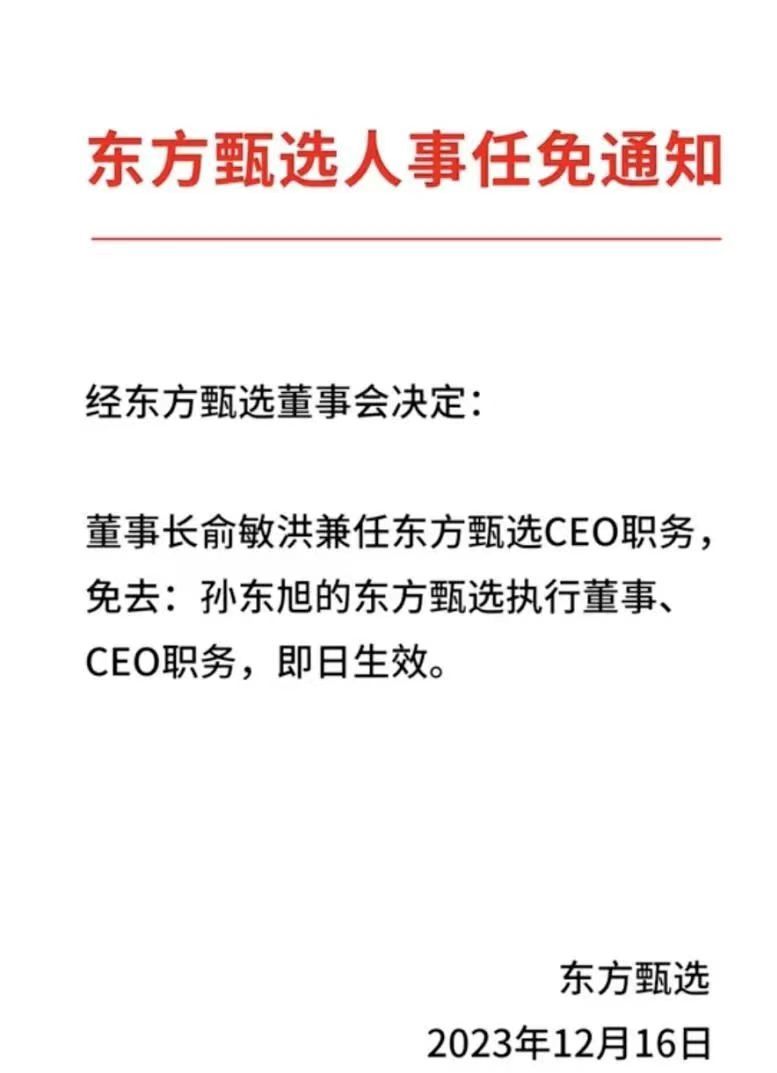 12月16日,东方甄选发布通知:经东方甄选董事会决定,董事长俞敏洪兼任东方甄选CEO职务,免去:孙东旭的东方甄选执行董事、CEO职务,即日生效。