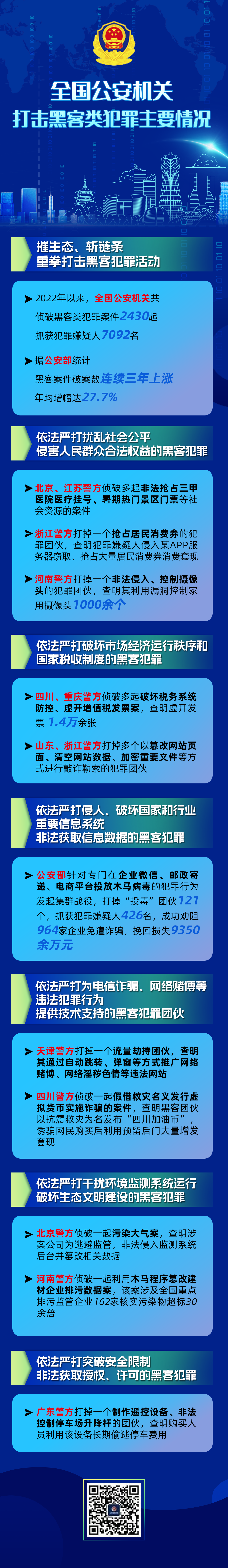 公安部网络安全保卫局副局长李彤介绍,2022年以来,全国公安机关共侦破黑客类犯罪案件2430起、抓获犯罪嫌疑人7092名,有效斩断了以黑客犯罪为核心的黑产链条。