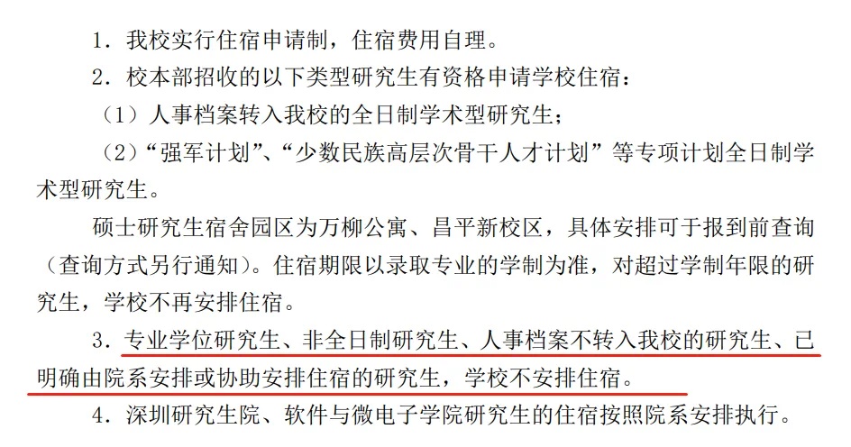 北京大学2024年硕士研究生招生简章(校本部)明确,专业学位研究生学校不安排住宿。另据清华大学2024年硕士研究生招生简章,因该校学生宿舍资源紧张,定向就业类别(不转档案)硕士生不安排学生宿舍住宿。