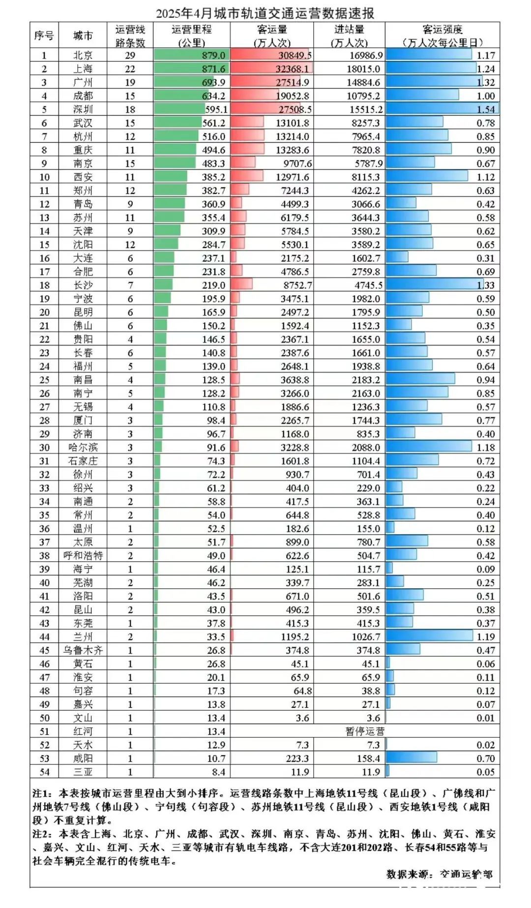 若除去仅开通有轨电车的城市,佛山地铁2025年4月的客流强度全国几乎处于末游。图源:交通运输部