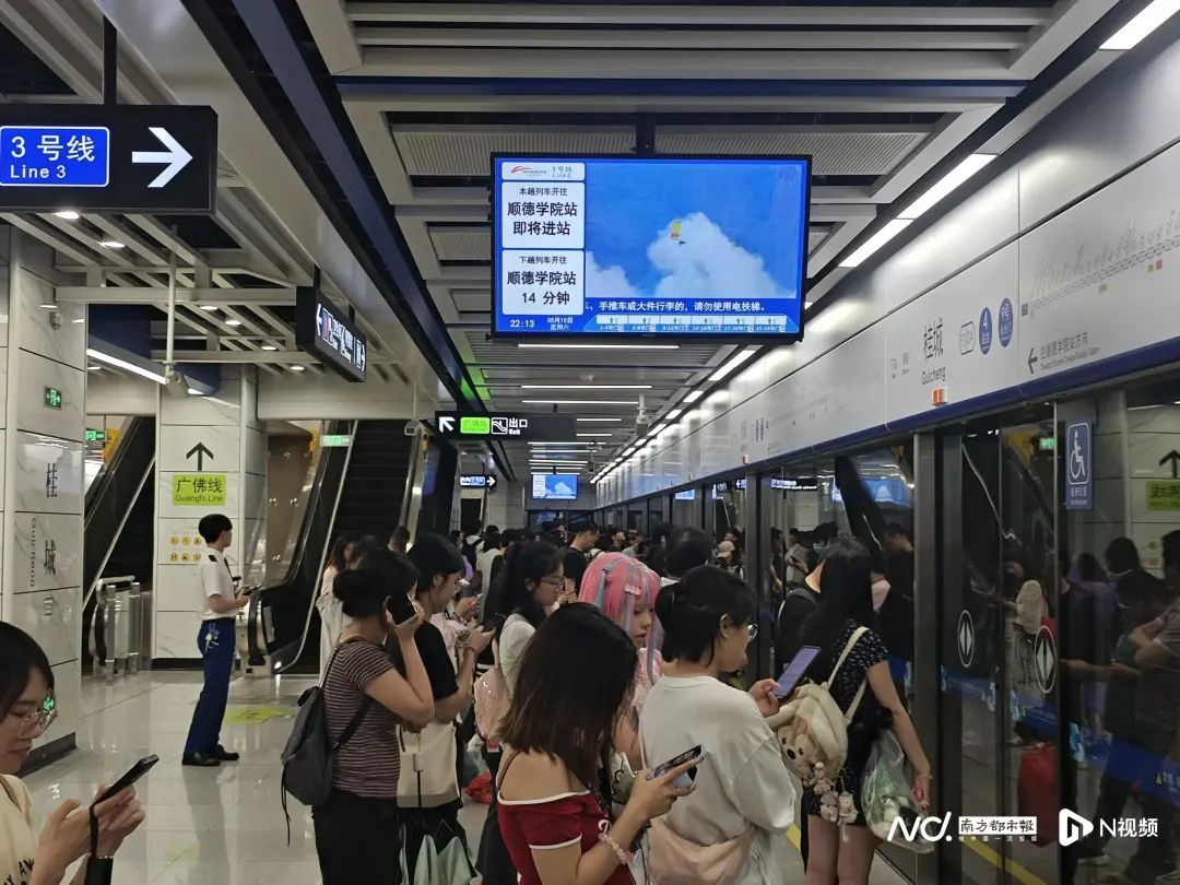 5月10日(周末)22:00左右,南都记者在桂城站搭乘佛山地铁3号线,当晚人流量较多,行车间隔为13—14分钟,在湾华站搭乘佛山2号线,行车间隔为12—13分钟。
