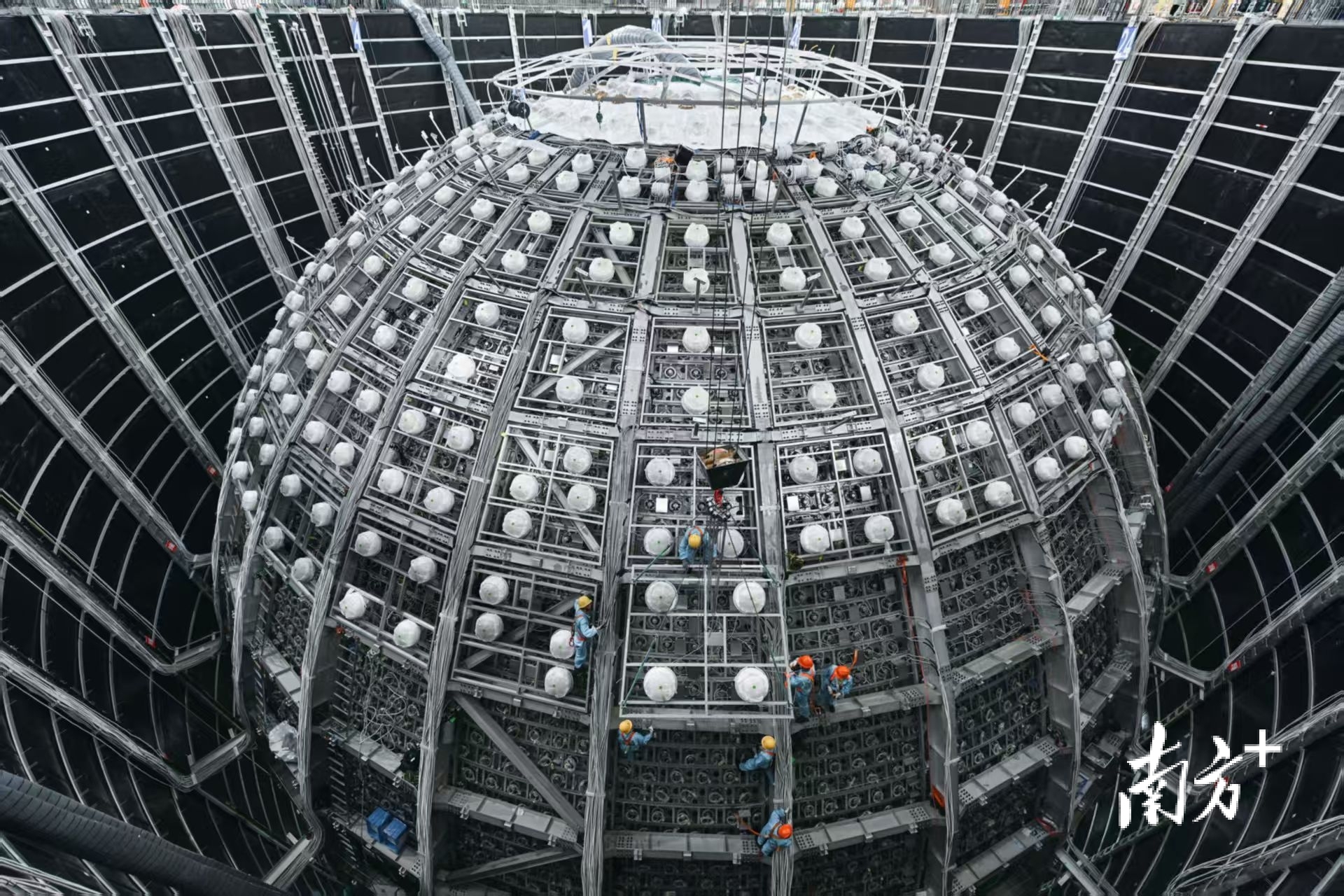 江门中微子实验探测器,中心探测器外工人正在高空安装光电倍增管模块,那是探测器的眼睛。 刘悦湘 摄