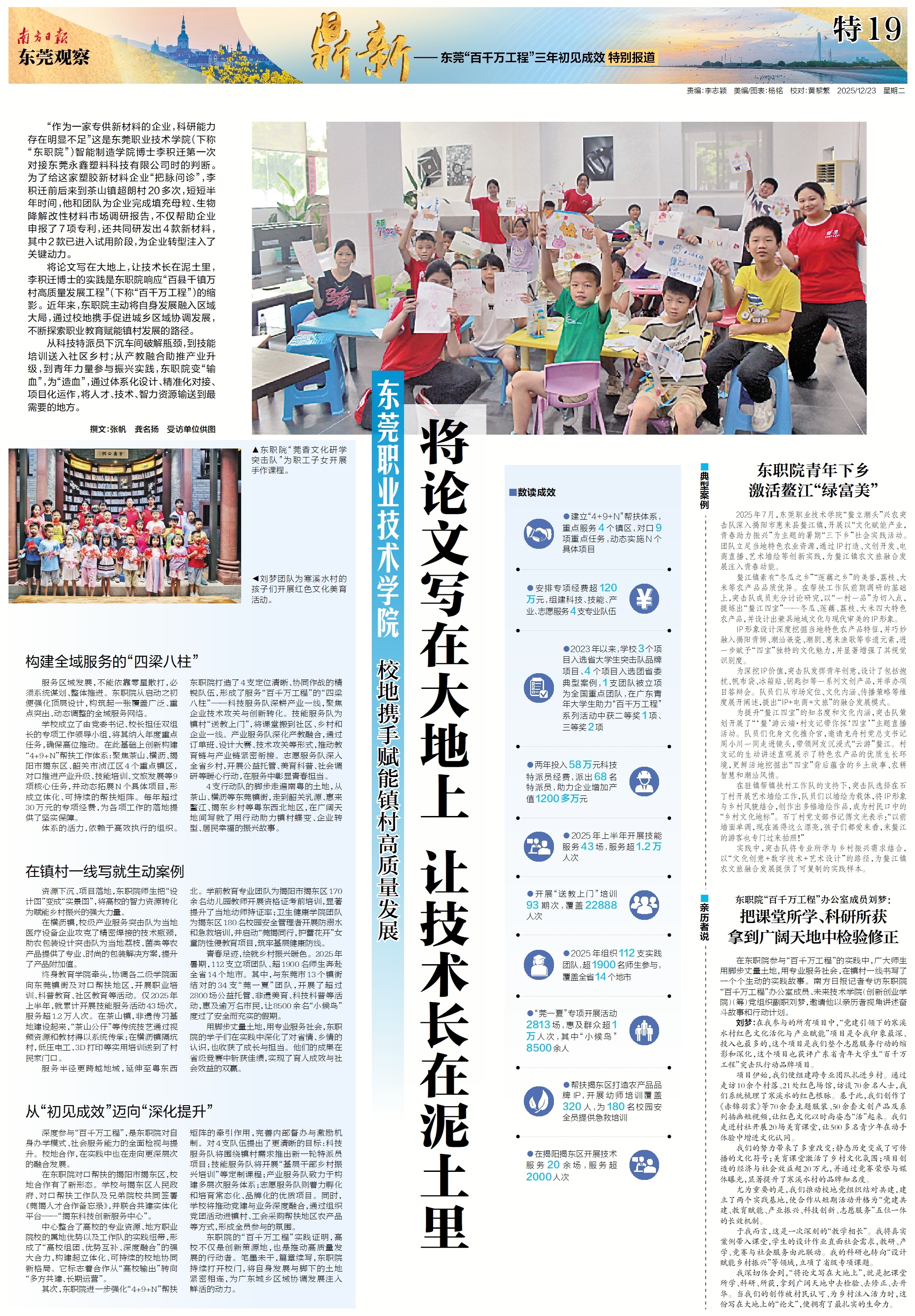 在东职院参与“百千万工程”的实践中,广大师生用脚步丈量土地,用专业服务社会,在镇村一线书写了一个个生动的实践故事。南方日报记者专访东职院“百千万工程”办公室成员、未来技术学院(创新创业学院)(筹)党组织副职刘梦,邀请他以亲历者视角讲述奋斗故事和行动计划。