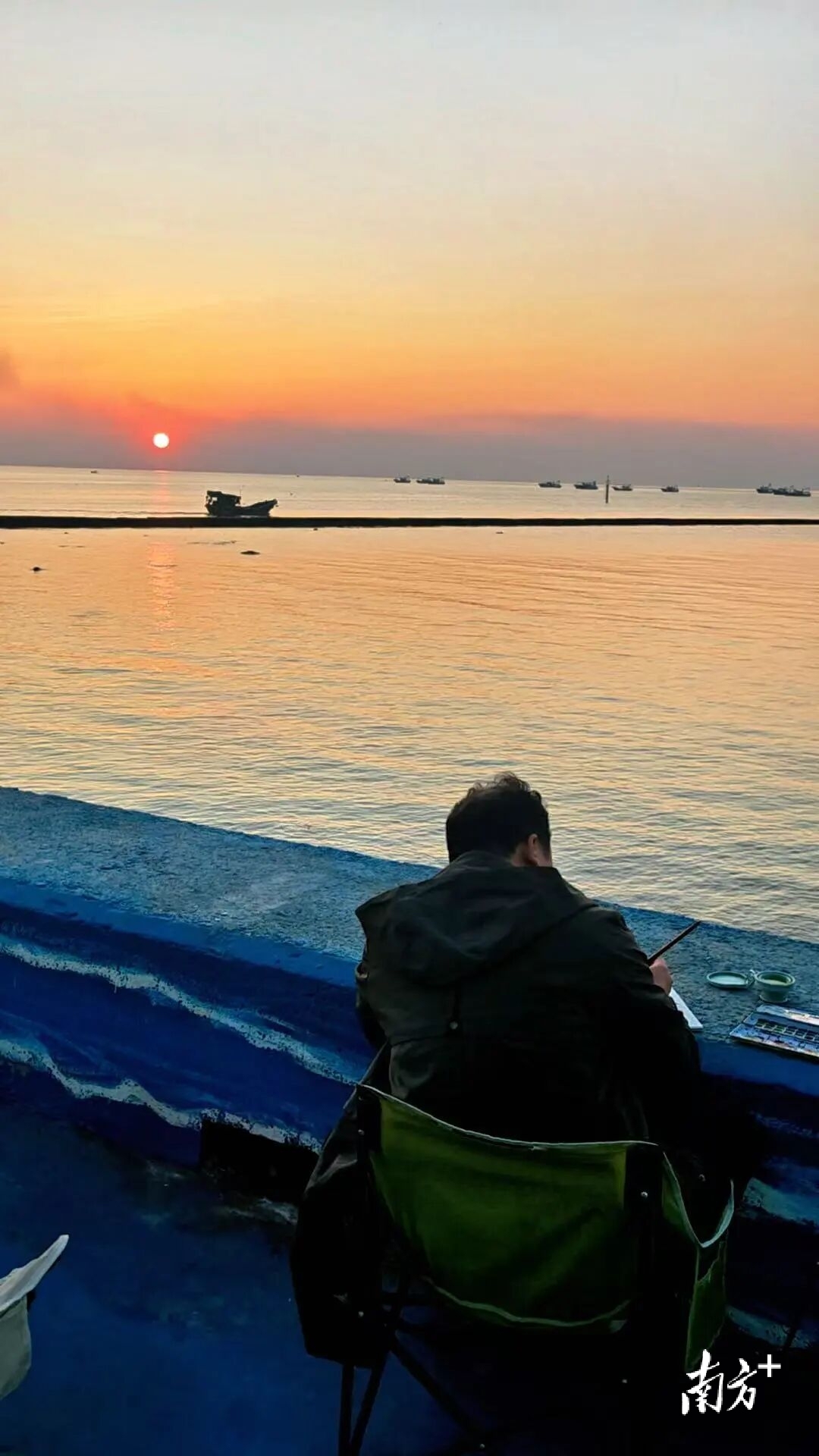 1月11日下午,小林老师来到遂溪江洪镇,把采风的第一笔落在海边的日落上。天空由湛蓝渐变为金橙,海面被夕阳切出一条亮闪闪的“光路”,远处渔船成了剪影,他用水彩把这份宁静与辽阔轻轻收进画面。
