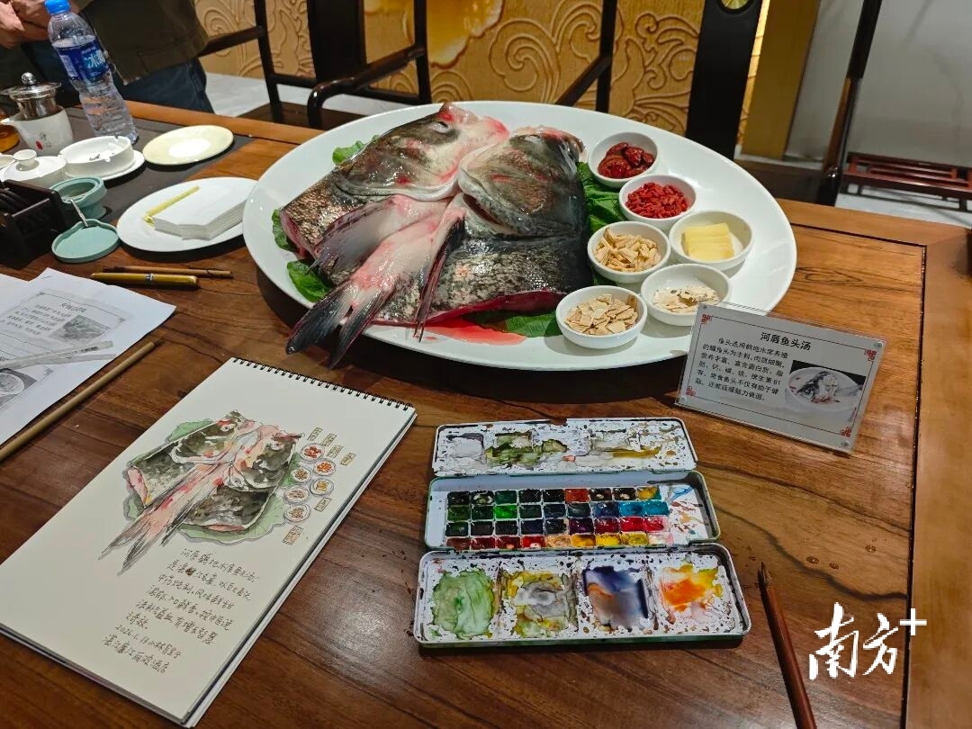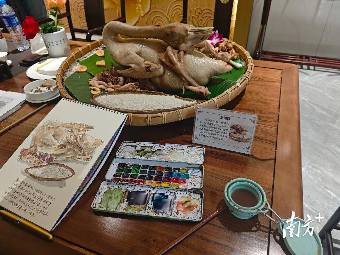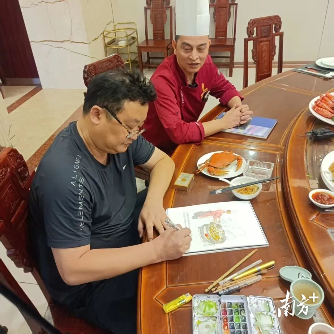 红木圆桌上,姜糖酒蟹、白灼吴阳脆虾等菜品引人垂涎,厨师长坐在一旁讲解食材挑选与烹饪诀窍,小林老师则俯身于速写本前,手中画笔不停,他时而抬头观察菜品细节,时而低头雕琢线条,将吴川菜的鲜香与烹饪的匠心尽数融入画中。