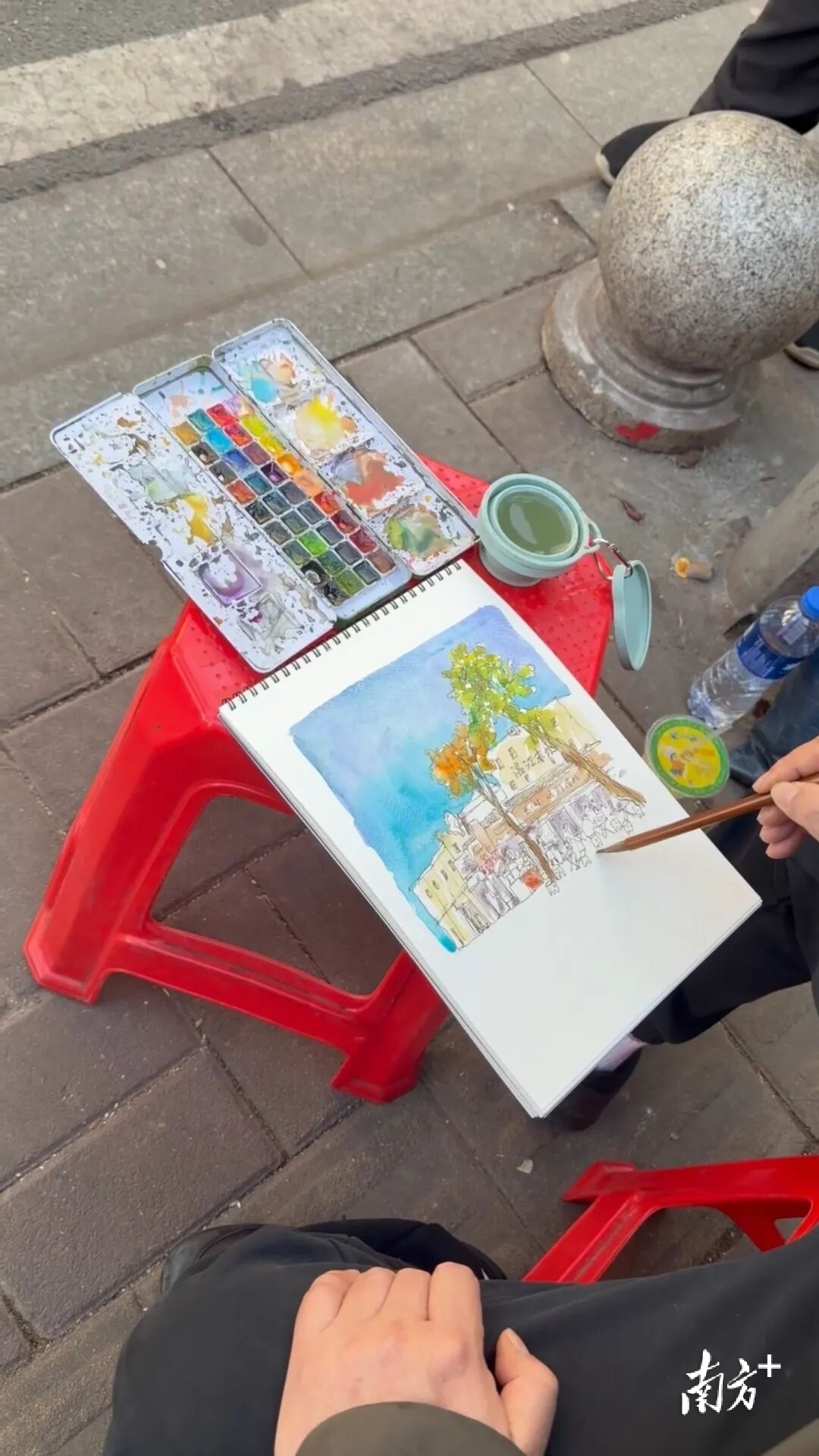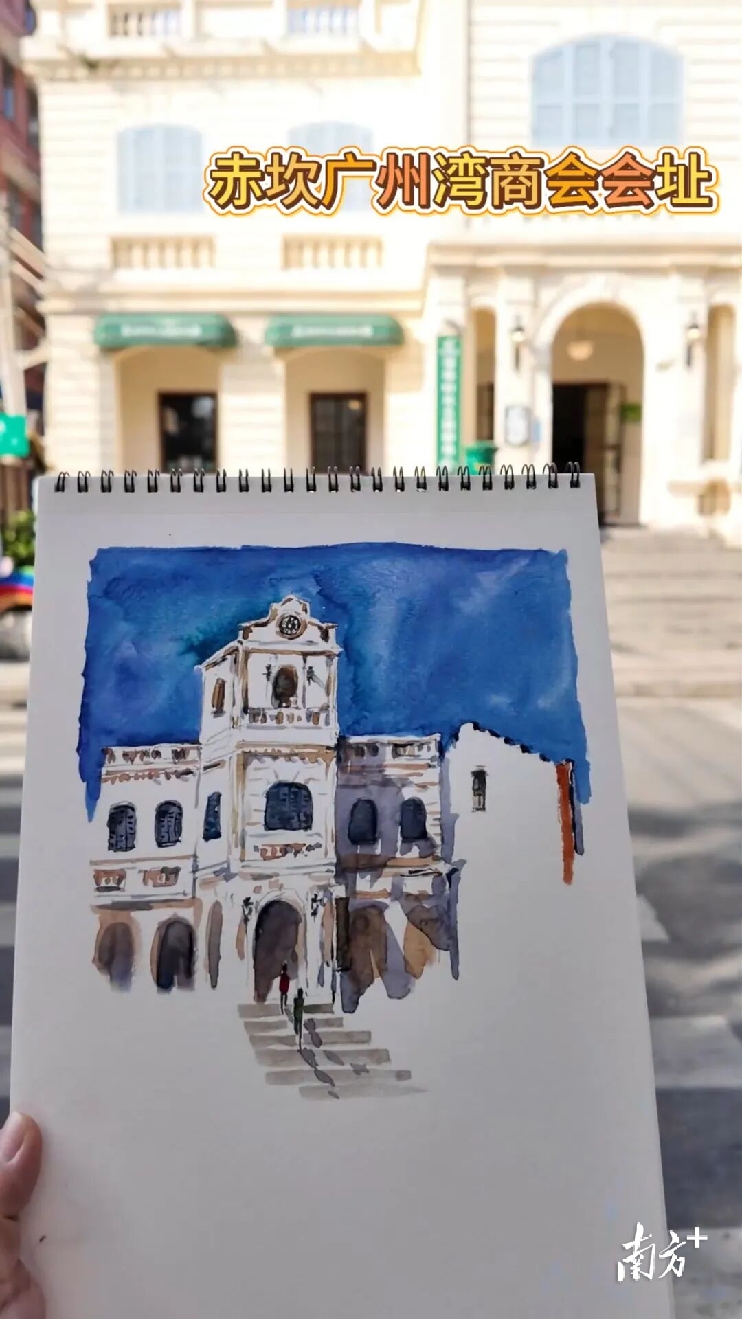 在广州湾商会会址前,小林老师仰头细辨建筑立面的欧式拱券与钟楼纹饰,画笔掠过百年骑楼的石质肌理,淡蓝底色晕染出老街的晴朗,建筑线条里藏着岁月的温度。
