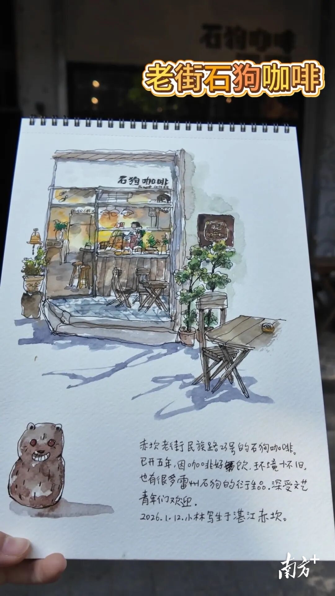 走近石狗咖啡店,木质窗棂里透出暖黄灯光,他在门口画下雷州石狗摆件的憨态,又以细腻笔触绘出店内的折叠木桌、绿植阴影,连咖啡杯上的蒸汽都晕染得松软。