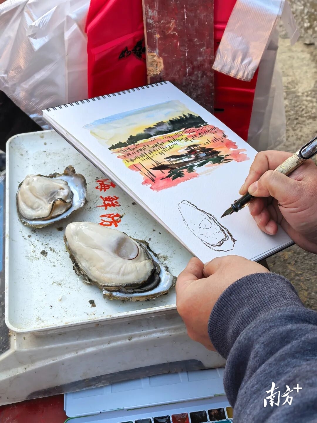 在采风路途中,小林老师还走进了坡头区,在坡头乡野间寻找具有当地特色的海鲜美食,用画笔定格坡头的鲜美肌理。