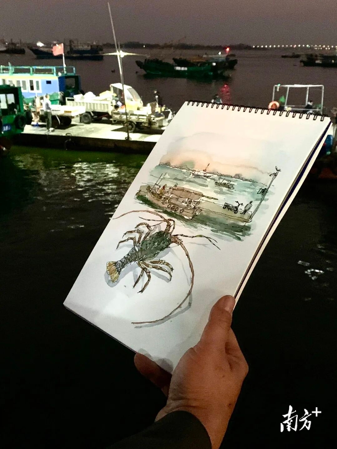 小林老师深入海鲜批发市场采风,沿着摊位缓步前行,近距离观察商贩分拣、称重海鲜的娴熟动作,端详各类海货的形态肌理,还不时向摊主请教本地海鲜的品种特性与时令特点,用手机精准记录下每一个鲜活瞬间。随后,他来到码头观景台驻足,取出画笔,以极简的线条快速勾勒出渔港渔船和海鲜的联动图景,寥寥数笔便尽显湛江海鲜贸易的灵动气息。