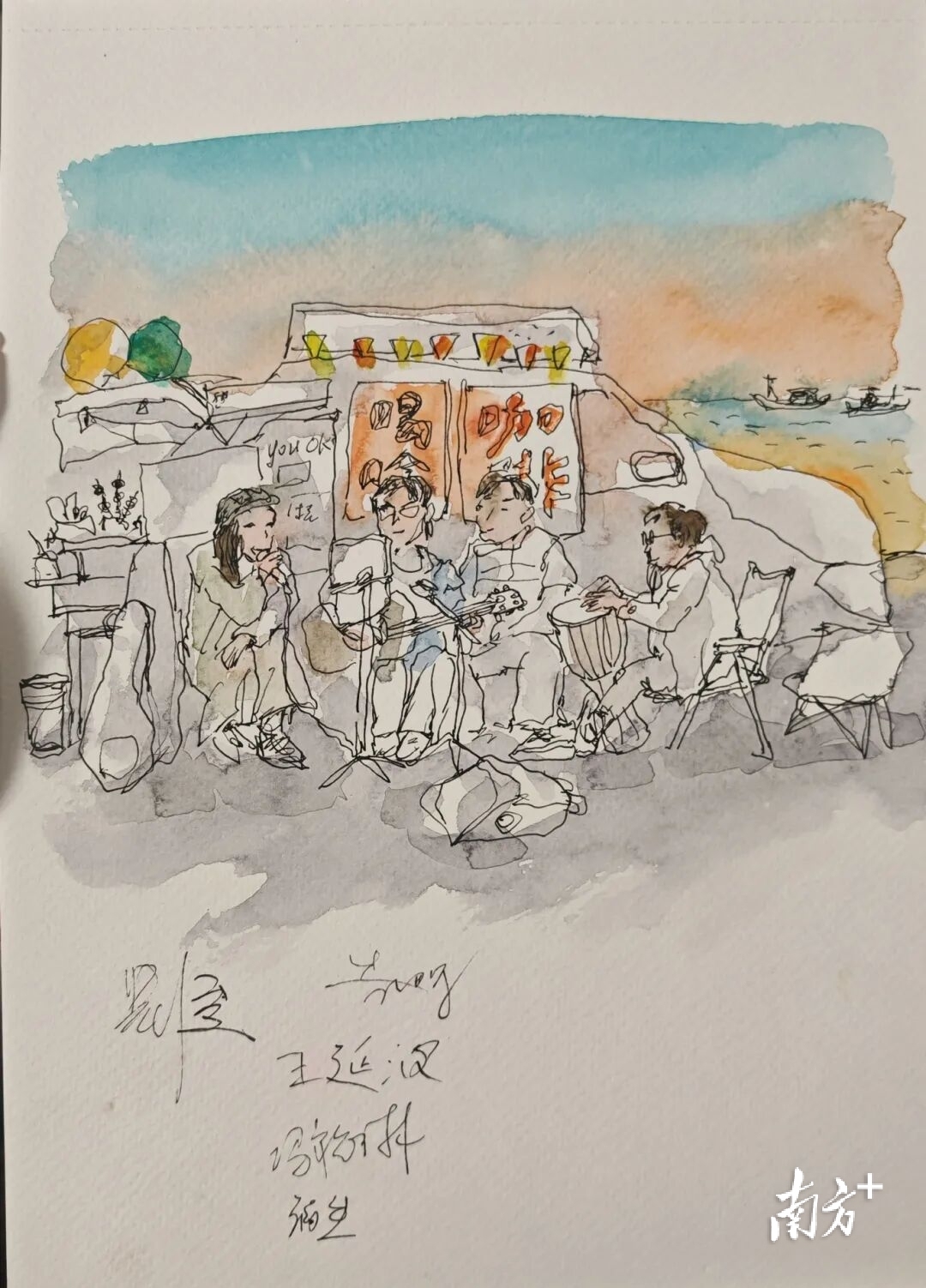 海风还没散去,江洪的热闹就接上了。几位房车车友把咖啡店开在海边,吉他拨弦、鼓点跟拍,歌声在晚霞里荡开。小林老师现场铺纸,把四个人弹唱的瞬间画了下来:折叠椅、乐器、围坐的姿态和海边的背景一并入画。画作完成后,他邀请四位表演者以及当地镇党委书记在画上签名留念。