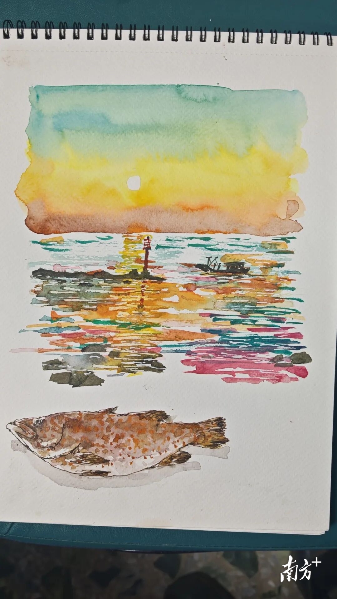 随后,小林老师还把“海景”和“海味”放在同一页里。在饭店里,他又画下一条鱼,并把它安排在海景画面的下方:上半幅是江洪的海天与晚霞,下半幅是刚端上桌的鲜鱼,把“看见的江洪”和“尝到的江洪”巧妙拼接成一张独特的记忆明信片。