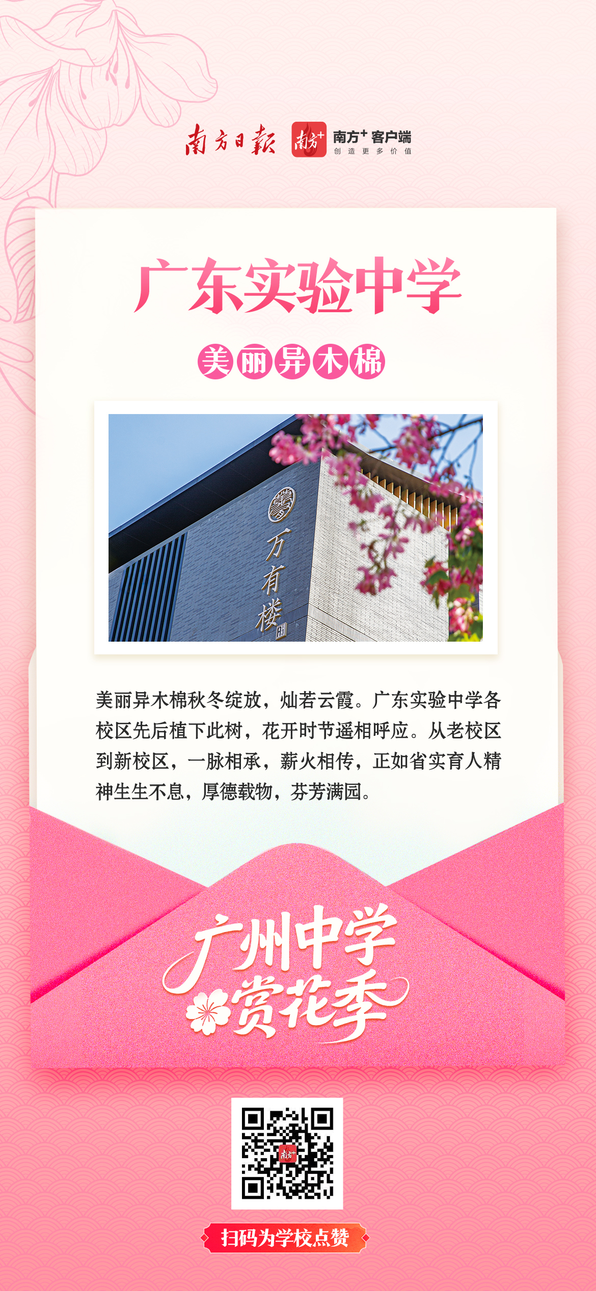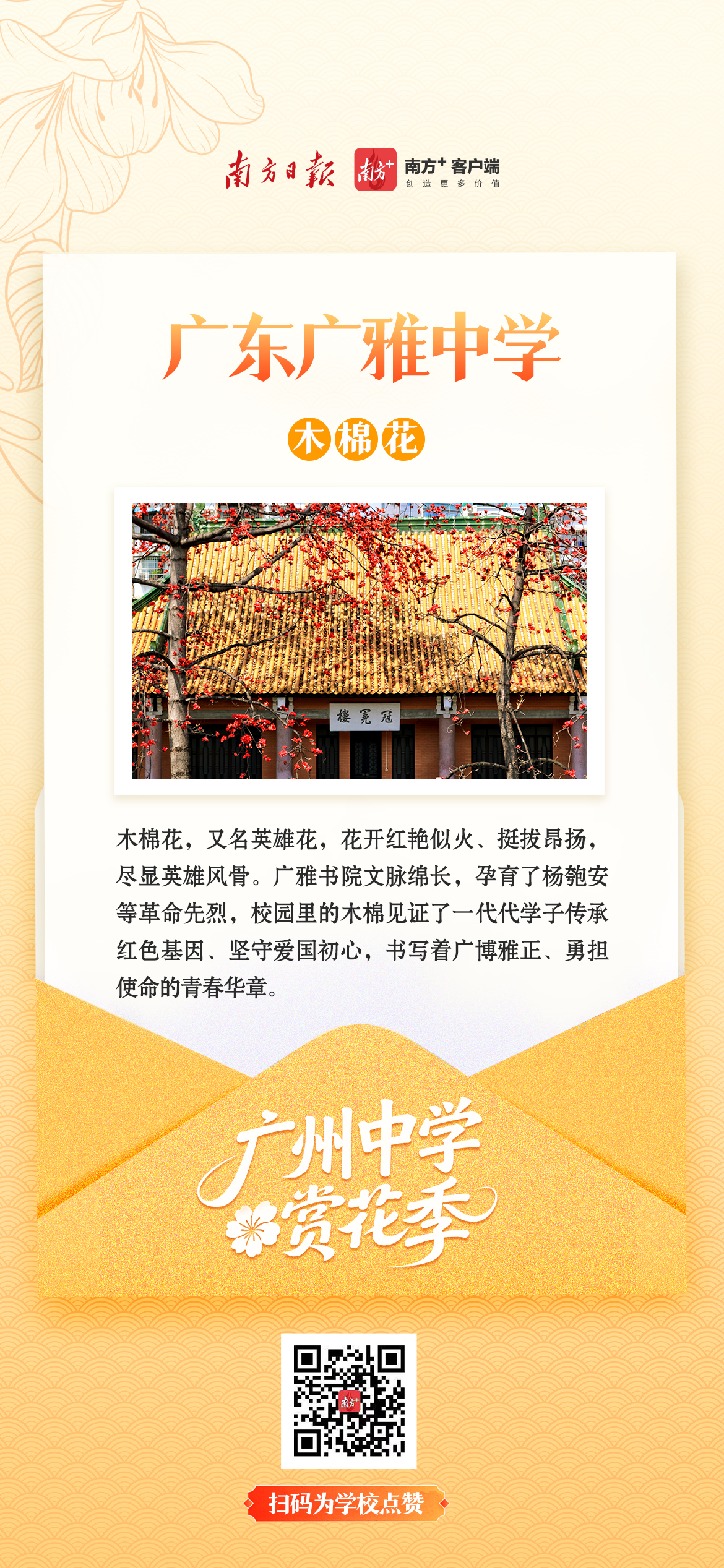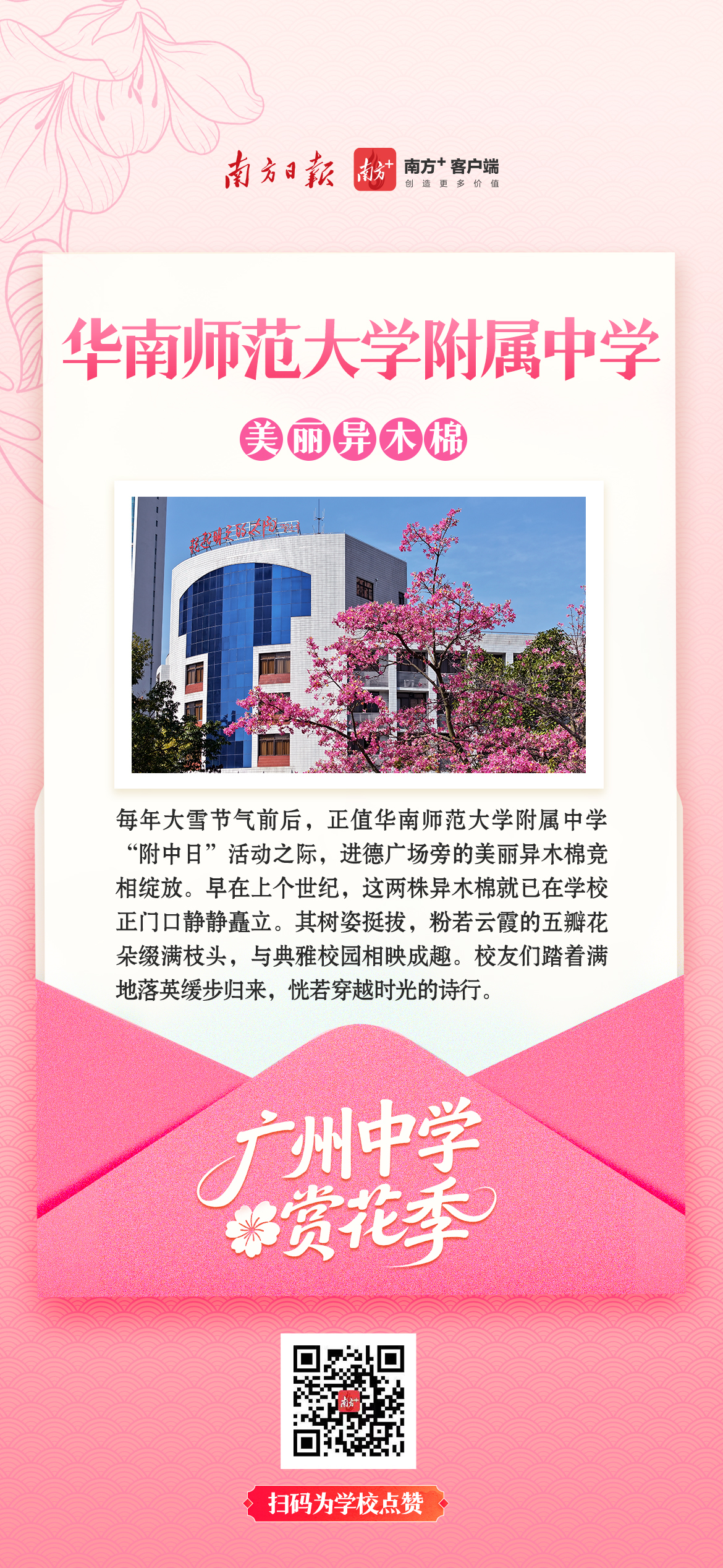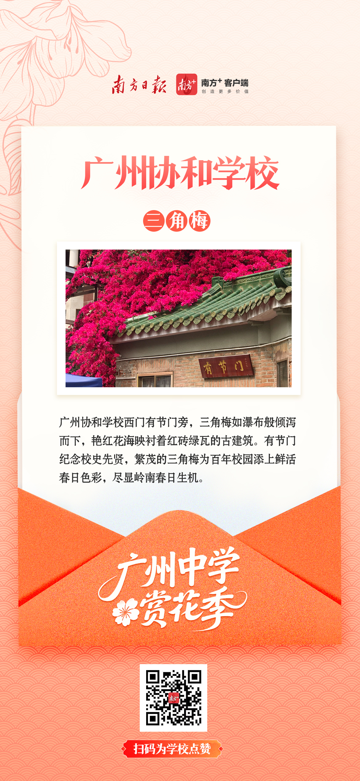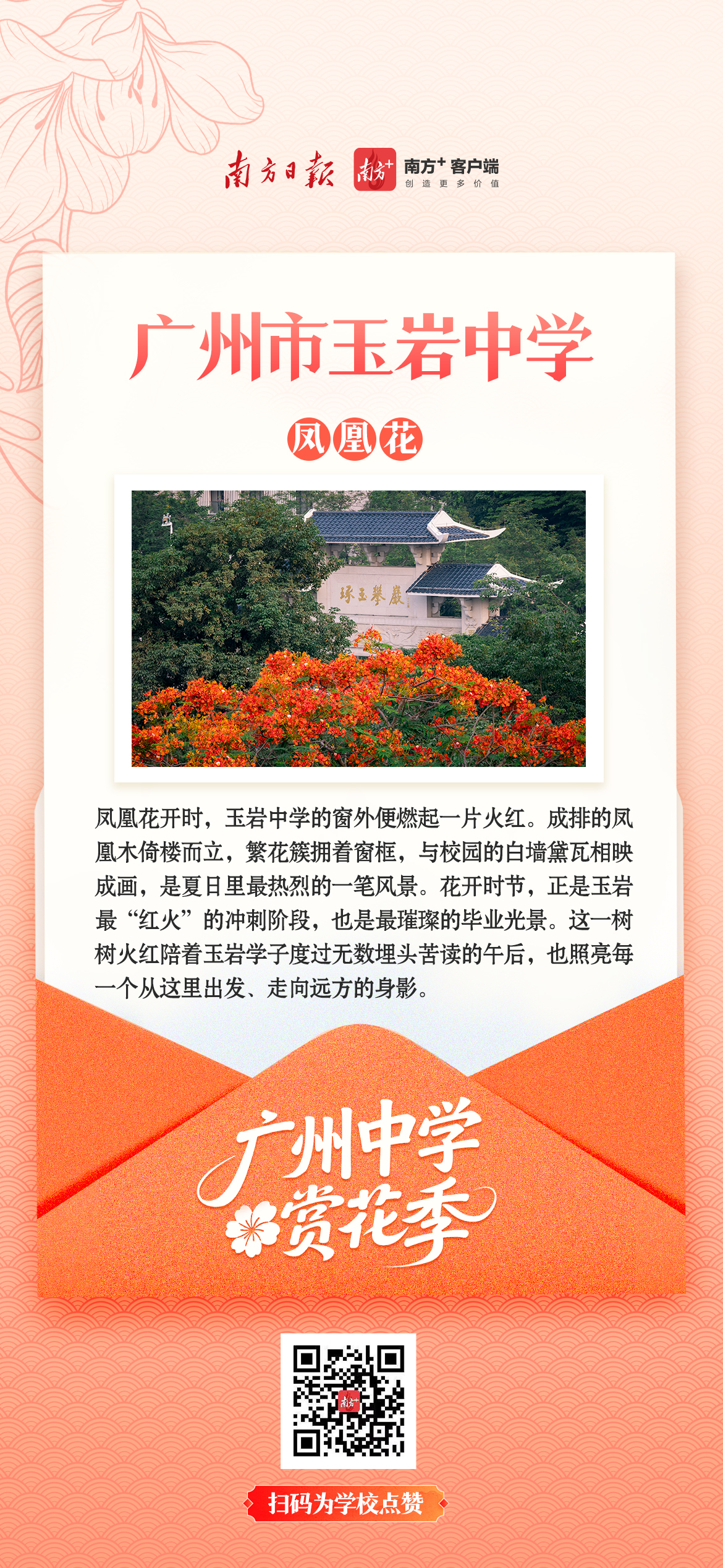 木棉擎起红烛,凤凰花燃在枝头,三角梅爬满围墙……这些花不只开在季节里,更开在一代代学子的青春记忆中。它们陪着少年们晨读暮写,看过走廊里奔跑的身影,听过教室里朗朗的书声,也见证着一所所中学的精神传承。