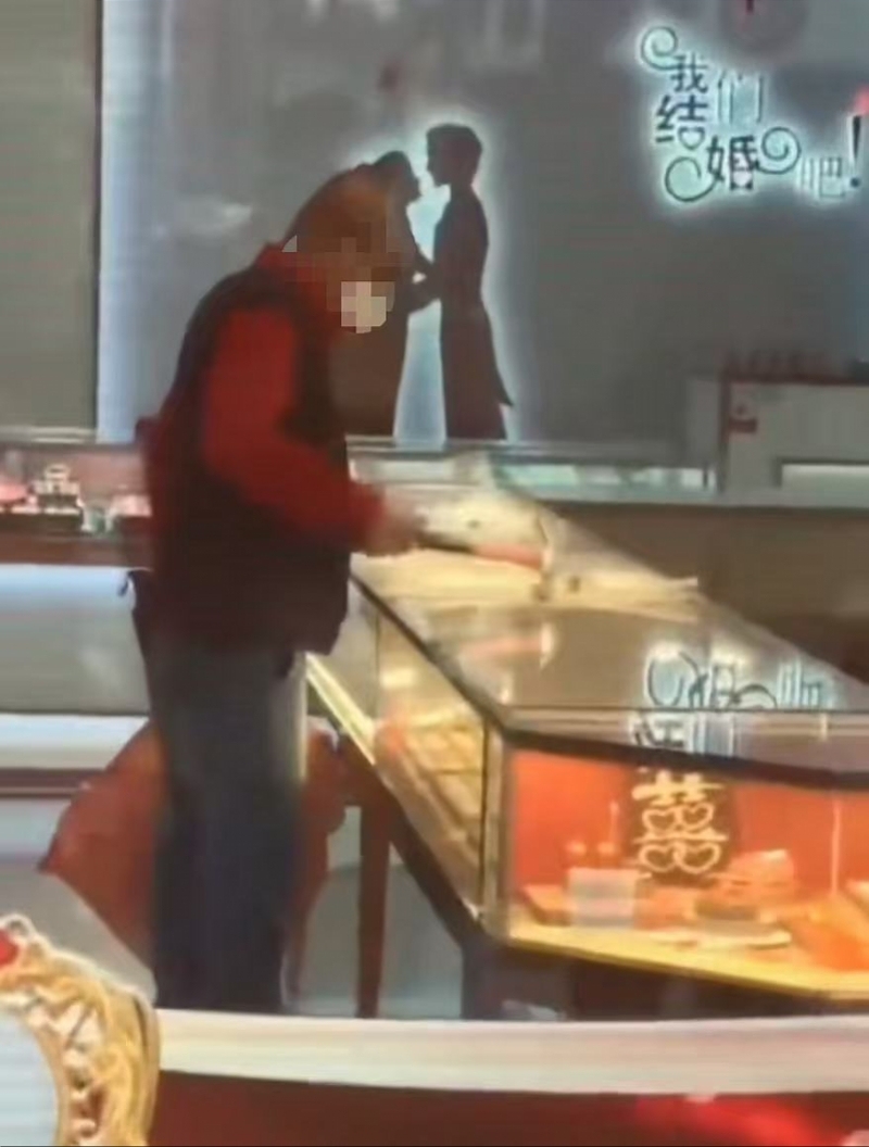 男子在金饰店内打砸柜台。网友发布的现场视频显示,在一家金饰店内,一名戴白色口罩的男子手持锤子打砸柜台,店外有多人围观。