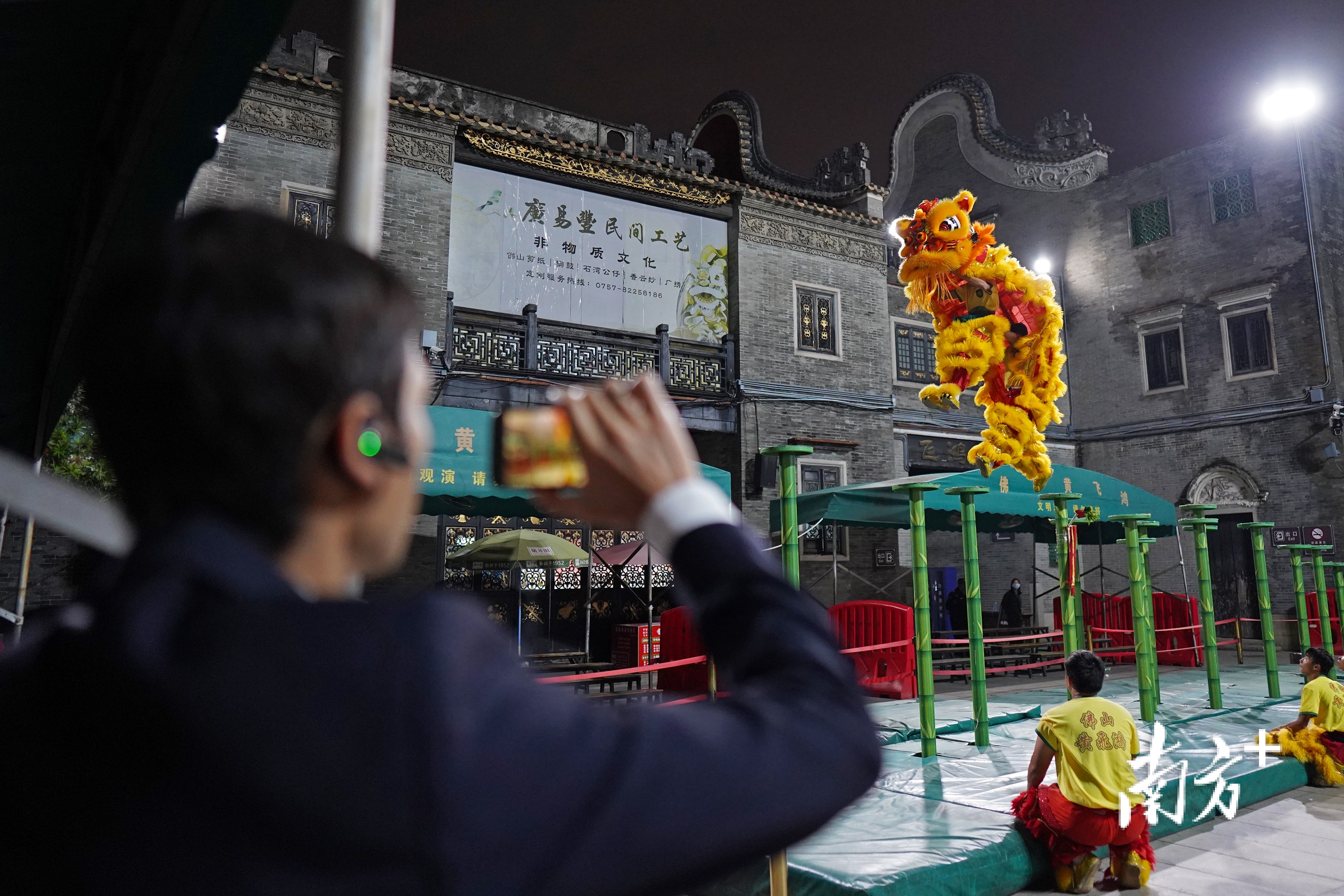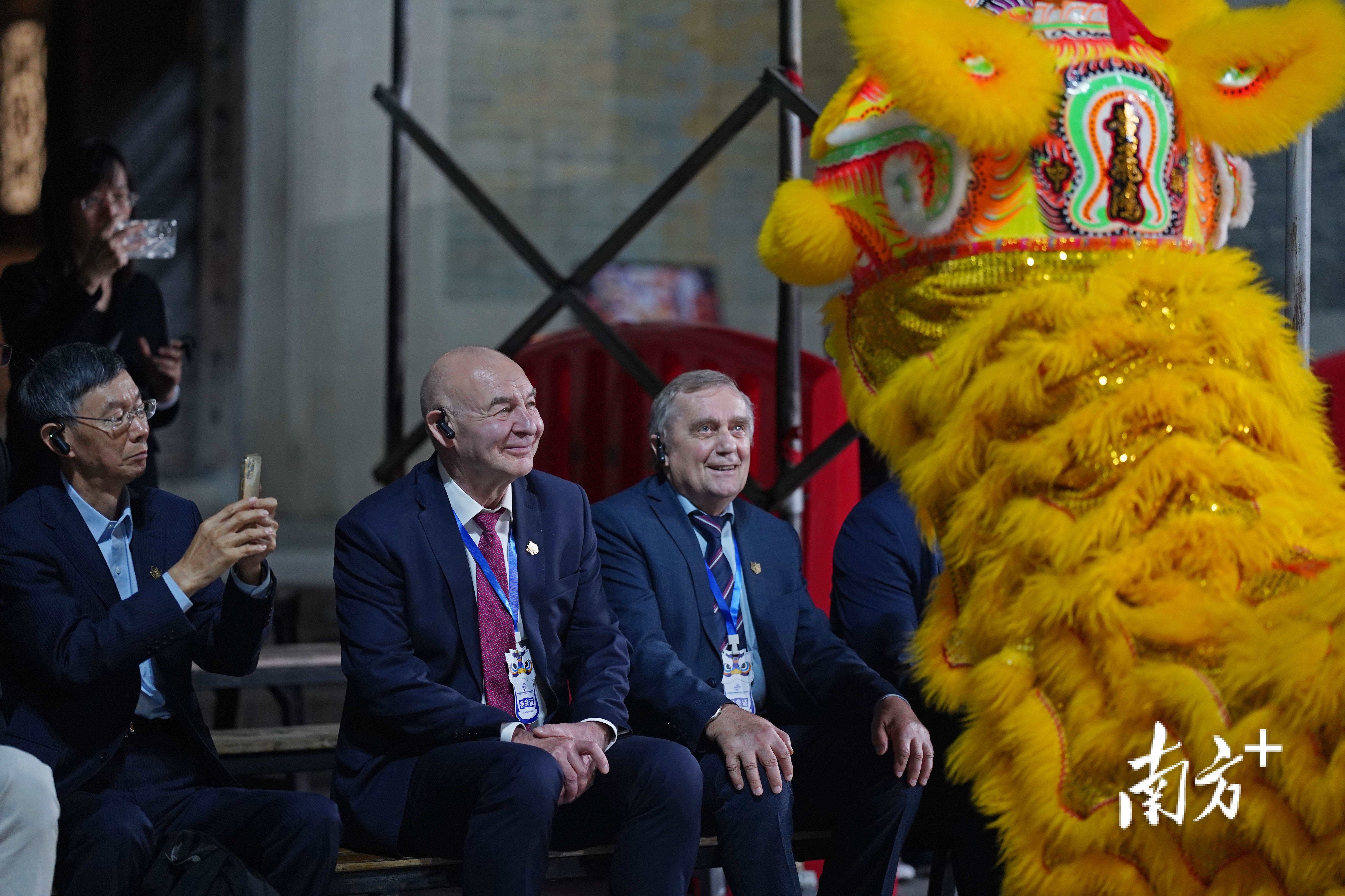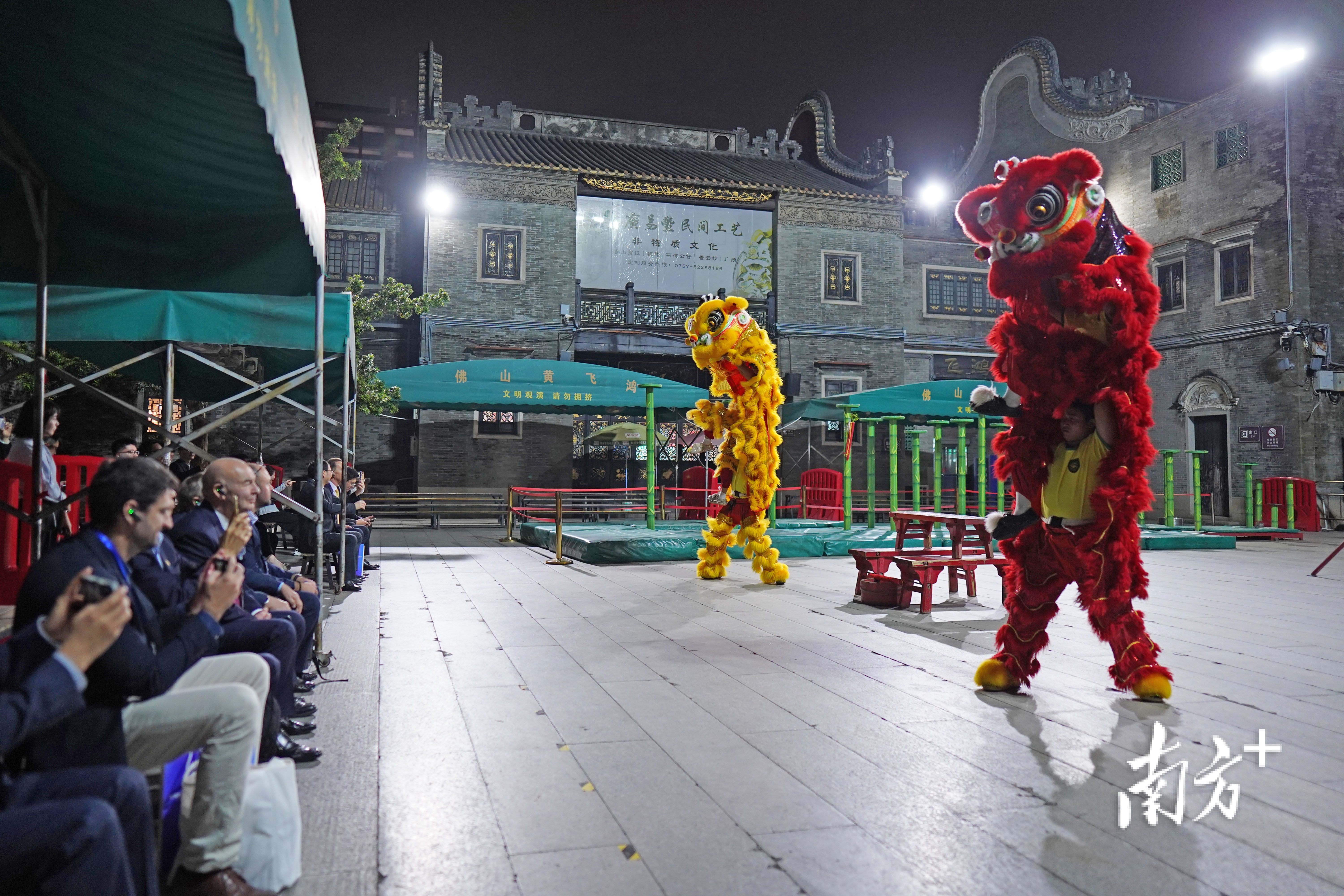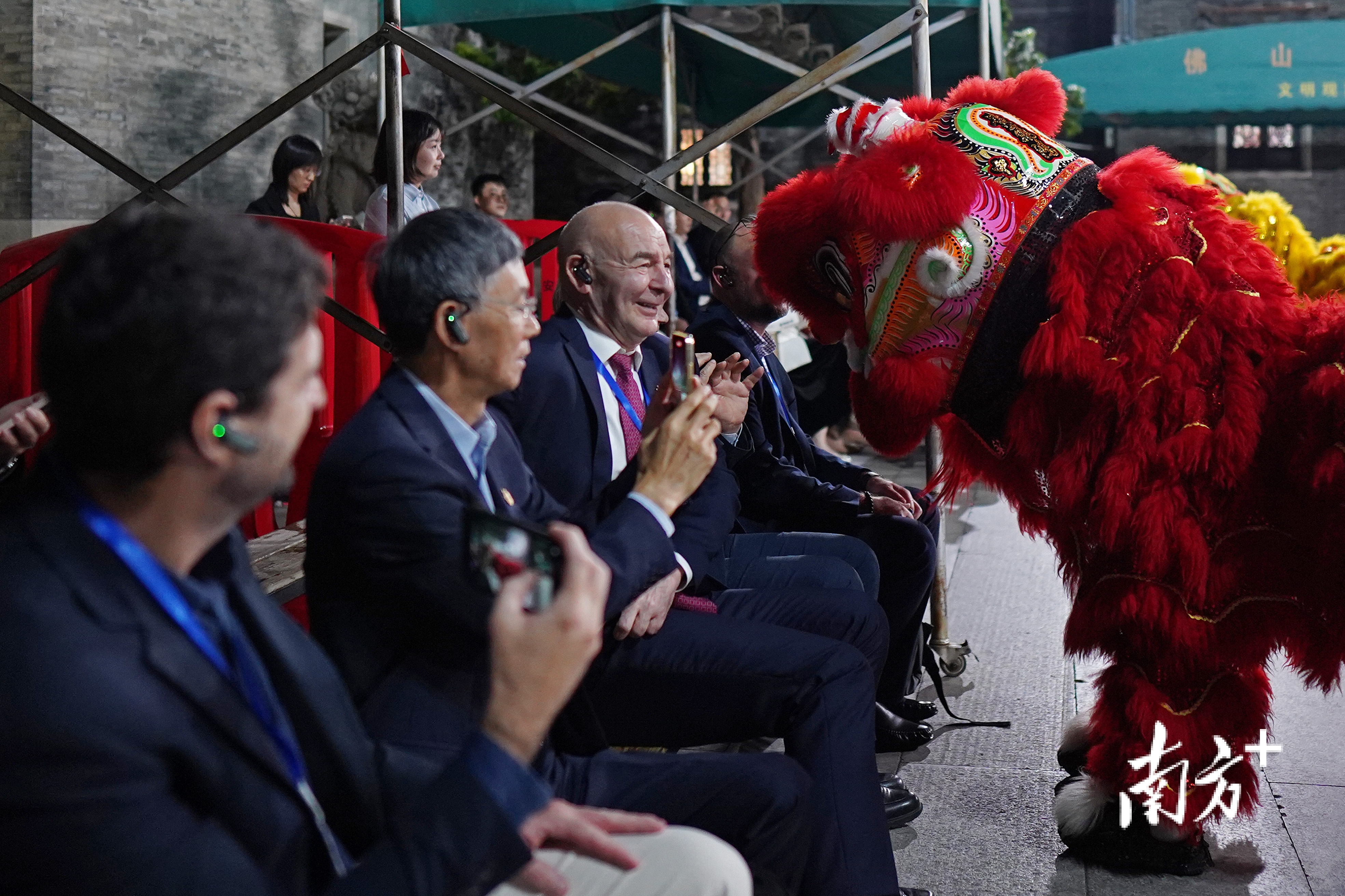 来到佛山,不得不看醒狮表演。在参观的最后,嘉宾们一起欣赏了精彩的醒狮表演。狮子热情洋溢地走到嘉宾跟前可爱互动,随后大显身手,在梅花桩上施展“凌波微步”,引得现场嘉宾连连鼓掌,并用手机记录精彩瞬间。