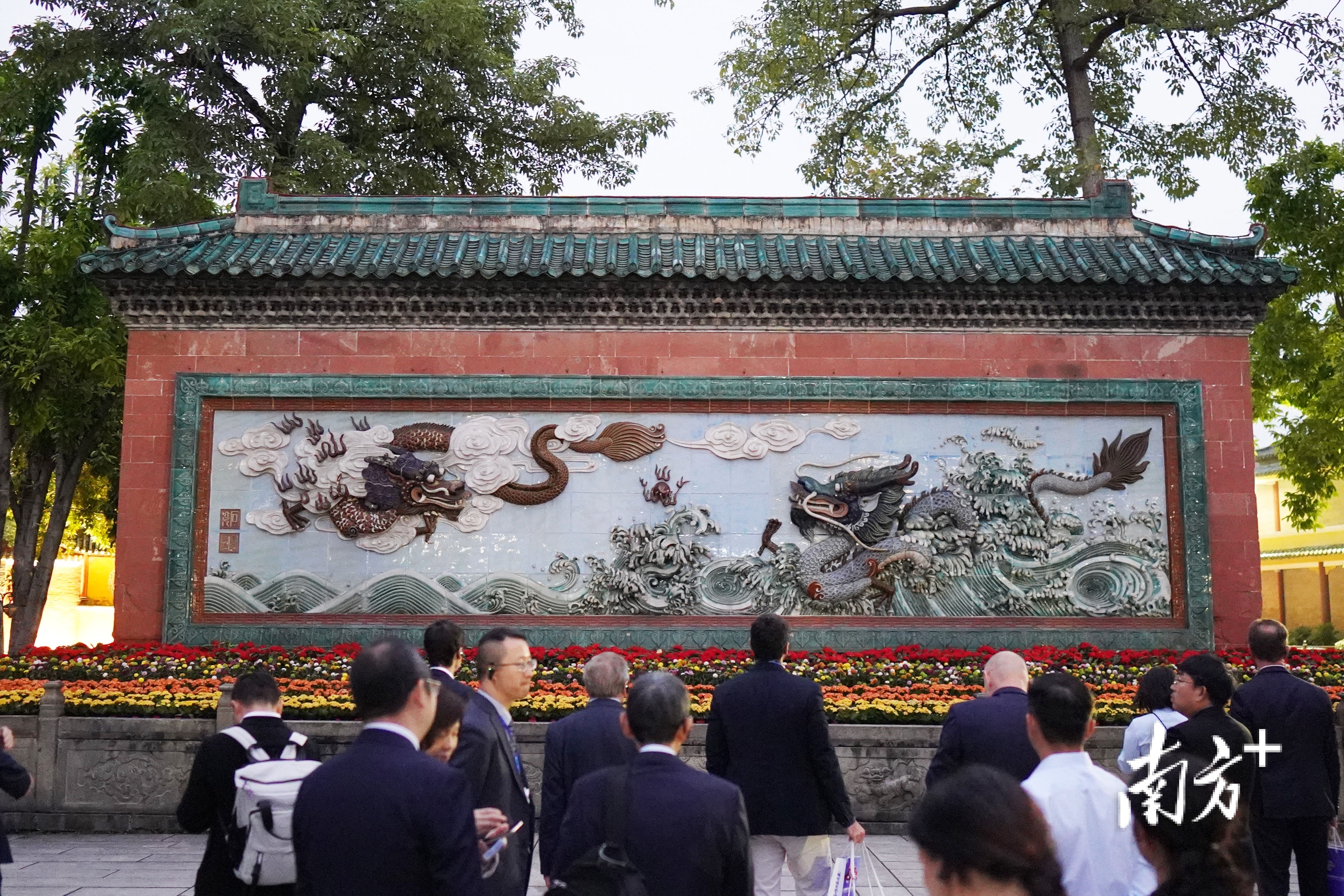 嘉宾们驻足在双龙壁前,聆听关于祖庙建筑的讲解。