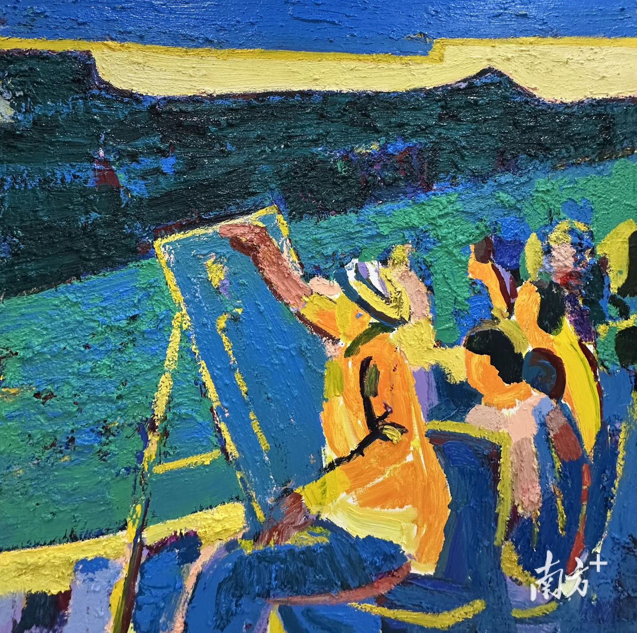 展厅中央,一幅色彩明媚、构图别致的《向阳而生3》吸引了众多观众细细品鉴,画布上翻滚的金色与墨绿交织,刻画了岭南大地上阳光穿透晨雾的活力瞬间;而与之呼应的《黄河传说》则以炽烈的红与强烈的黑勾勒出黄河岸边的原始生命力。