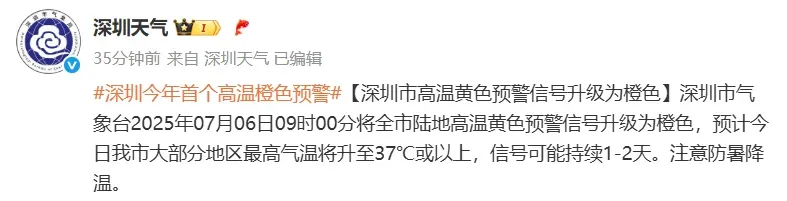 预计今明两天高温天气持续,最高气温可达36-37℃,中山市气象台2025年7月6日10时26分将全市高温预警信号升级为橙色,请做好各项防御工作。