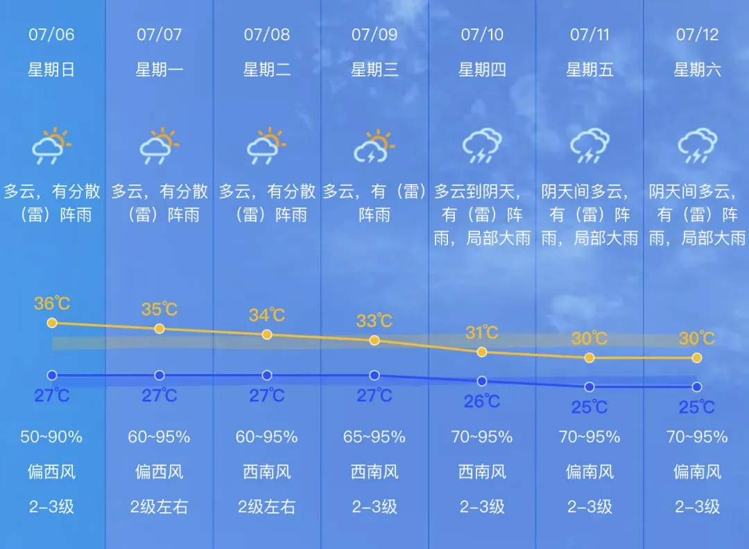 预计今天我市多云,有分散(雷)阵雨,气温27℃到36℃,吹2-3级偏西风,相对湿度50%到90%。预计未来一周我市晴雨相伴,天气炎热,请注意防暑降温。紫外线强,请做好防暑防晒措施。