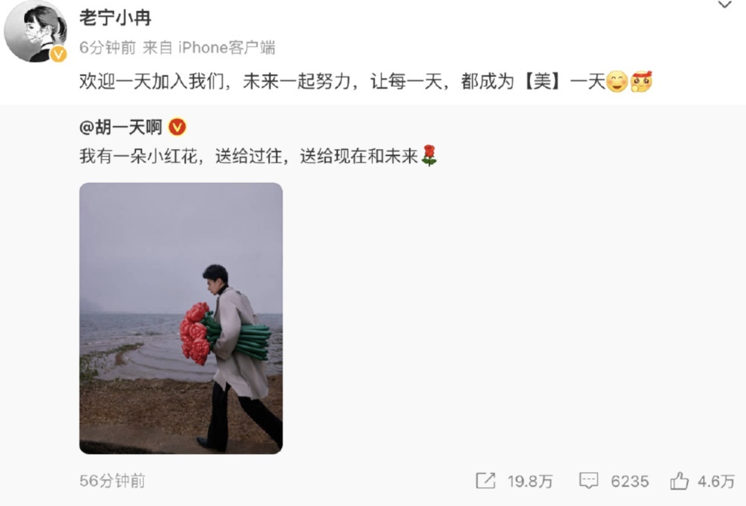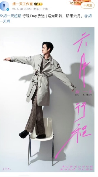 今年虽然没进组,但没放弃粉丝互动,发福利。前阵子撕拉片很火,胡一天也很快怕了几张发出来,粉丝很满意。