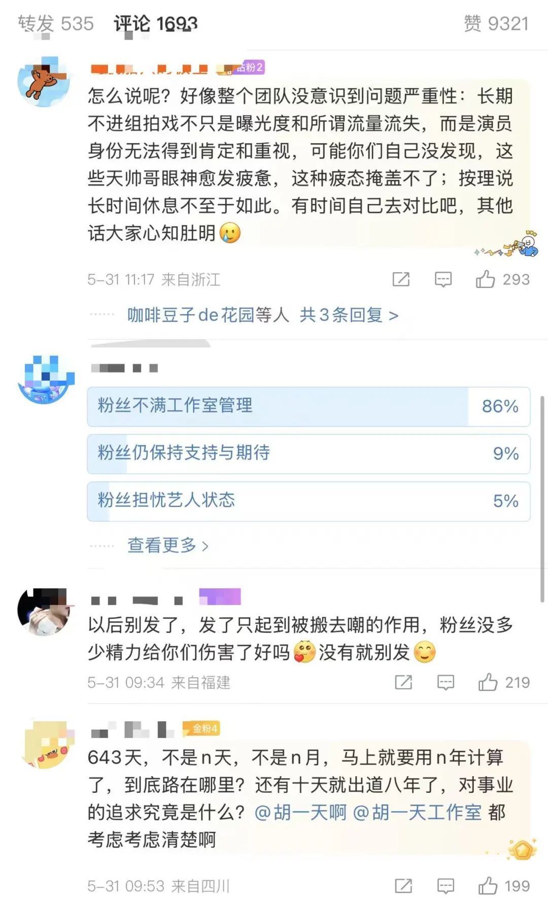 有人提到娱乐圈日新月异,一旦放慢步伐,长期没作品,立马有替代品。曝光度和热度一旦冷下来,资方就更不敢冒着风险用他了。现在和胡一天年龄段差不多,长得帅气的男艺人很多,并不是非他不可。