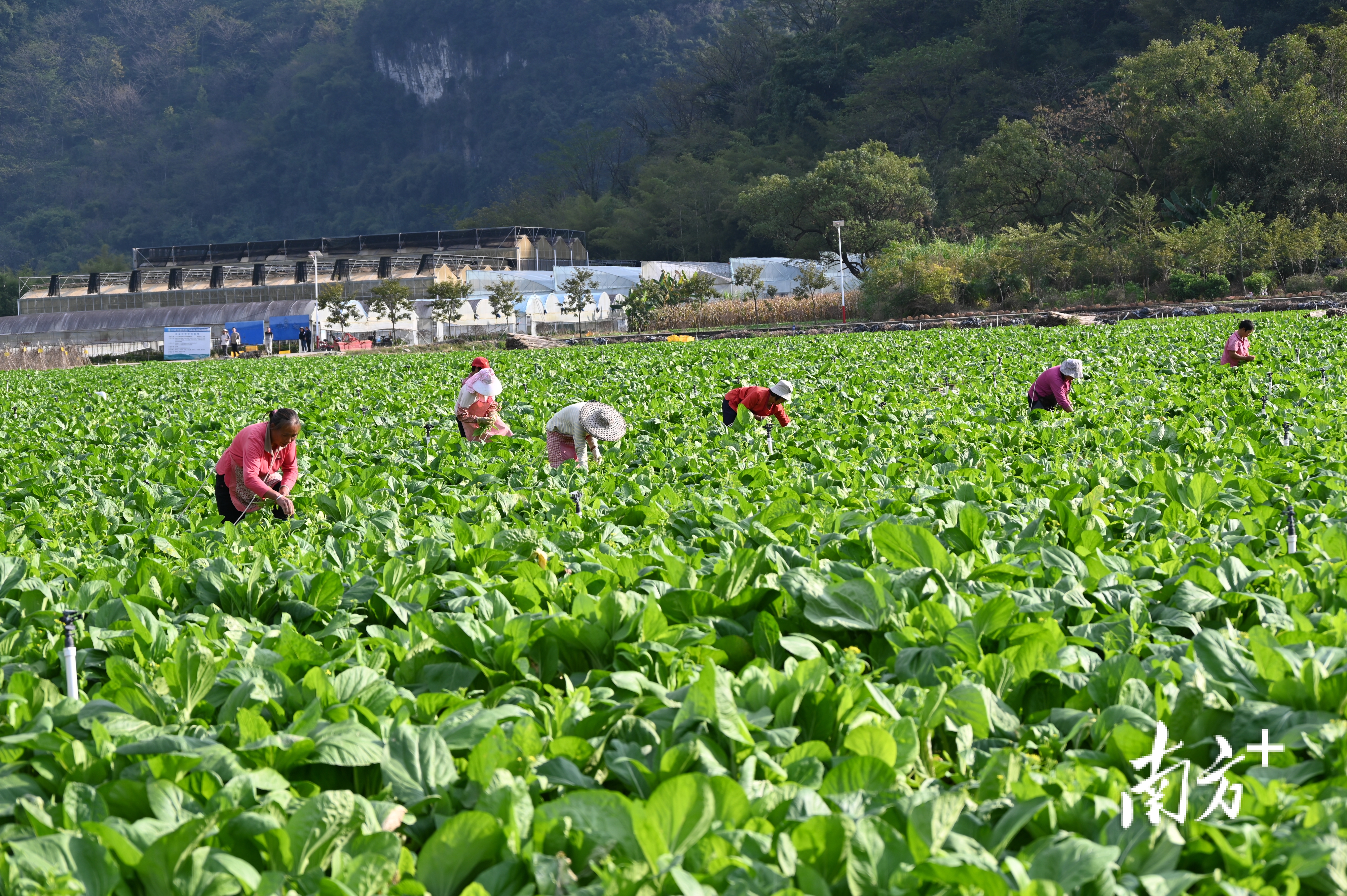 “今年种了200亩白菜心,目前长势很好,预计每亩能产6000斤。”基地负责人胡进俭介绍,为保障作物管护和采收效率,他特意聘请了30位当地村民负责田间工作。“我们种的蔬菜品质好,不愁销路,成熟后都直接销往珠三角的商场和超市,效益很可观。”