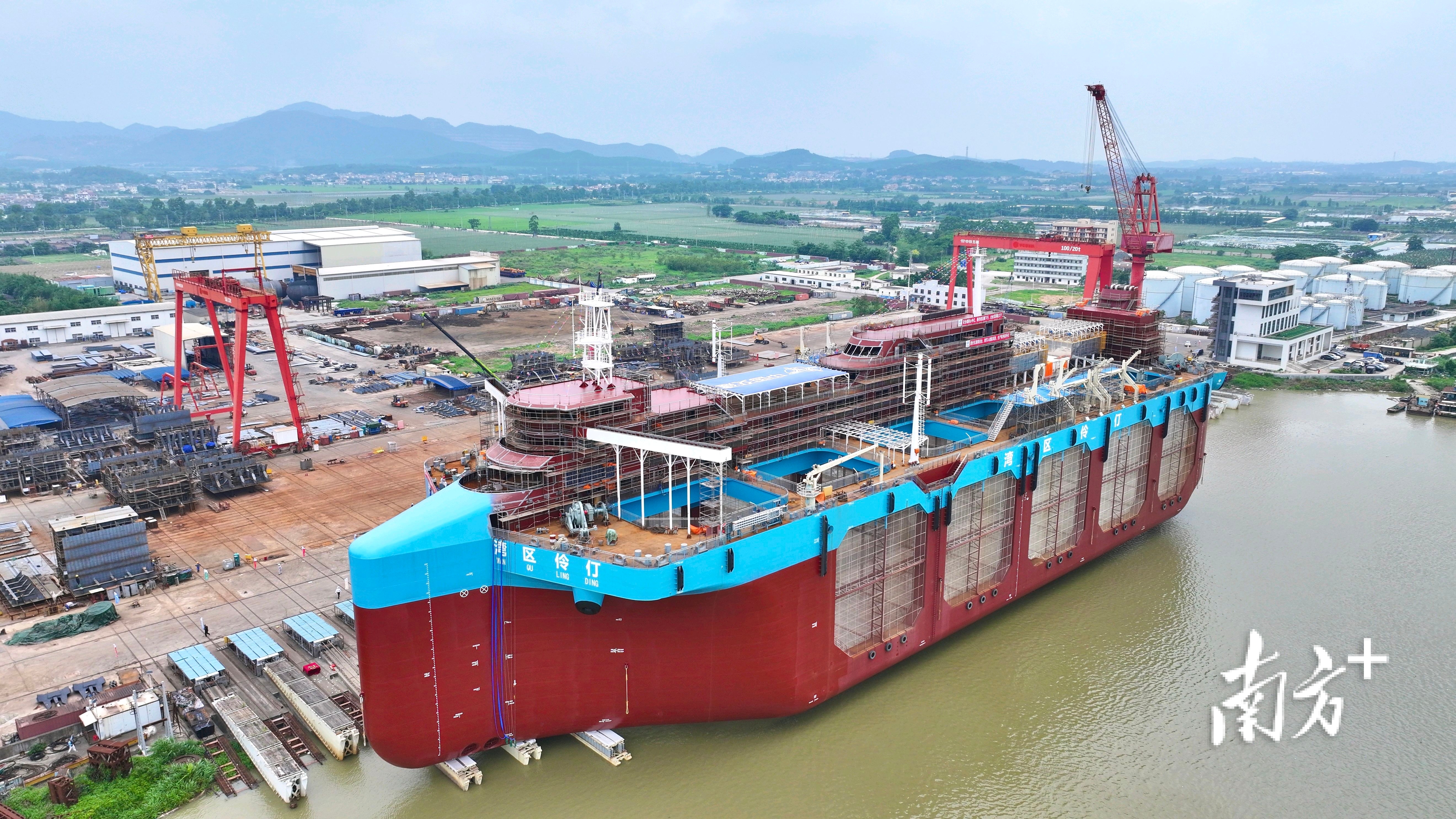 5月27日,全球首艘自航式水体自然交换型养殖工船“湾区伶仃”号在江门崖门水道成功下水。南方+记者 杨兴乐 摄