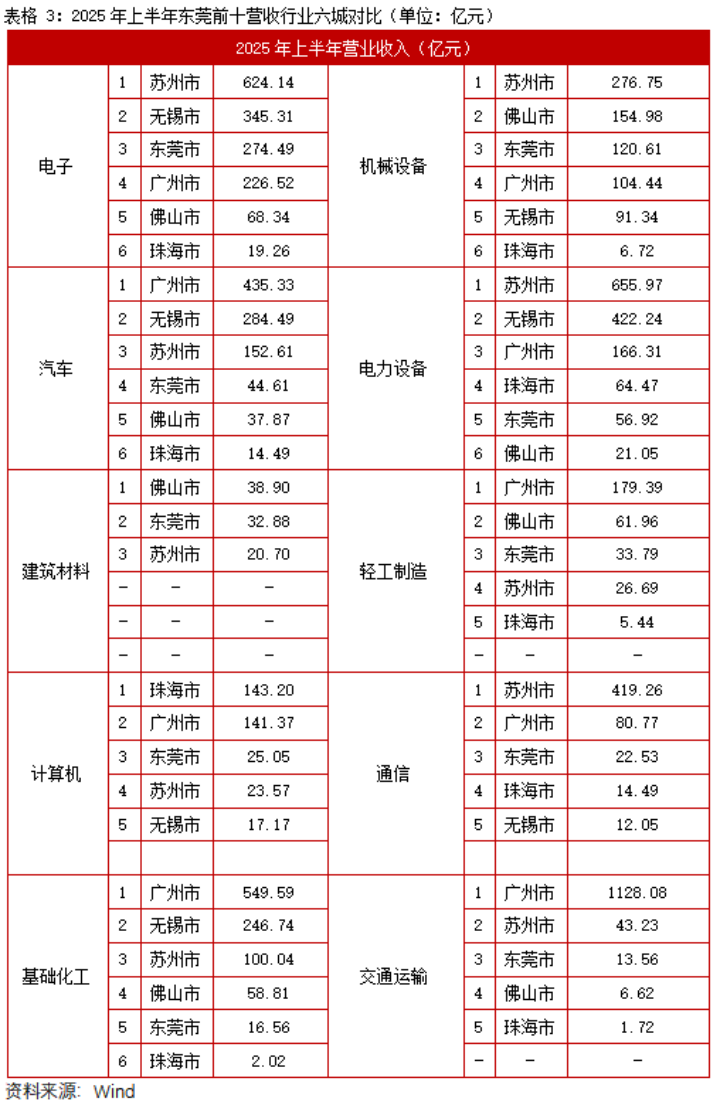 其他行业中,东莞同样展现了一定竞争优势:建筑材料和轻工制造行业均跻身前列,其中建筑材料行业在六城中位列第二,轻工制造则排名第三,凸显了传统加工业的韧性和适应性。计算机行业的排名第三,强调了东莞在高新技术领域的稳步升级;通信行业的第三位排名,印证了其在数字基建中的贡献;交通运输行业的第三位置,则映射出物流网络的支撑作用。