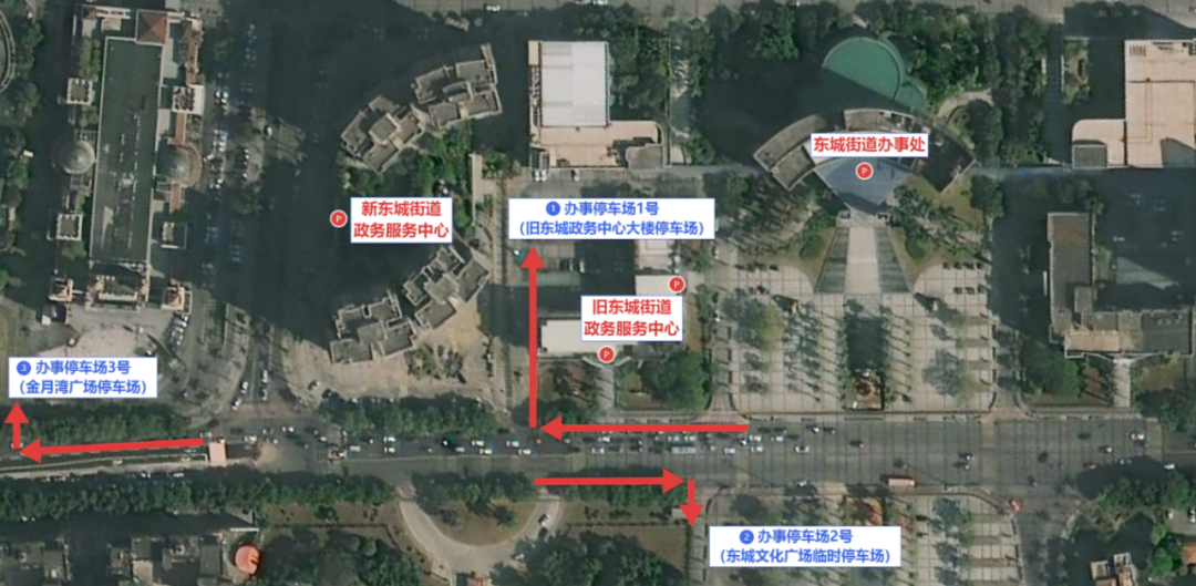 (二)自驾。市民可使用导航软件搜索“东莞市东城政务服务中心”,根据导航提示前往。为保障办事群众停车需求,自2025年10月9日起,旧政务中心大楼停车场(办事停车场1号)将面向群众开放,停车指引见下图: