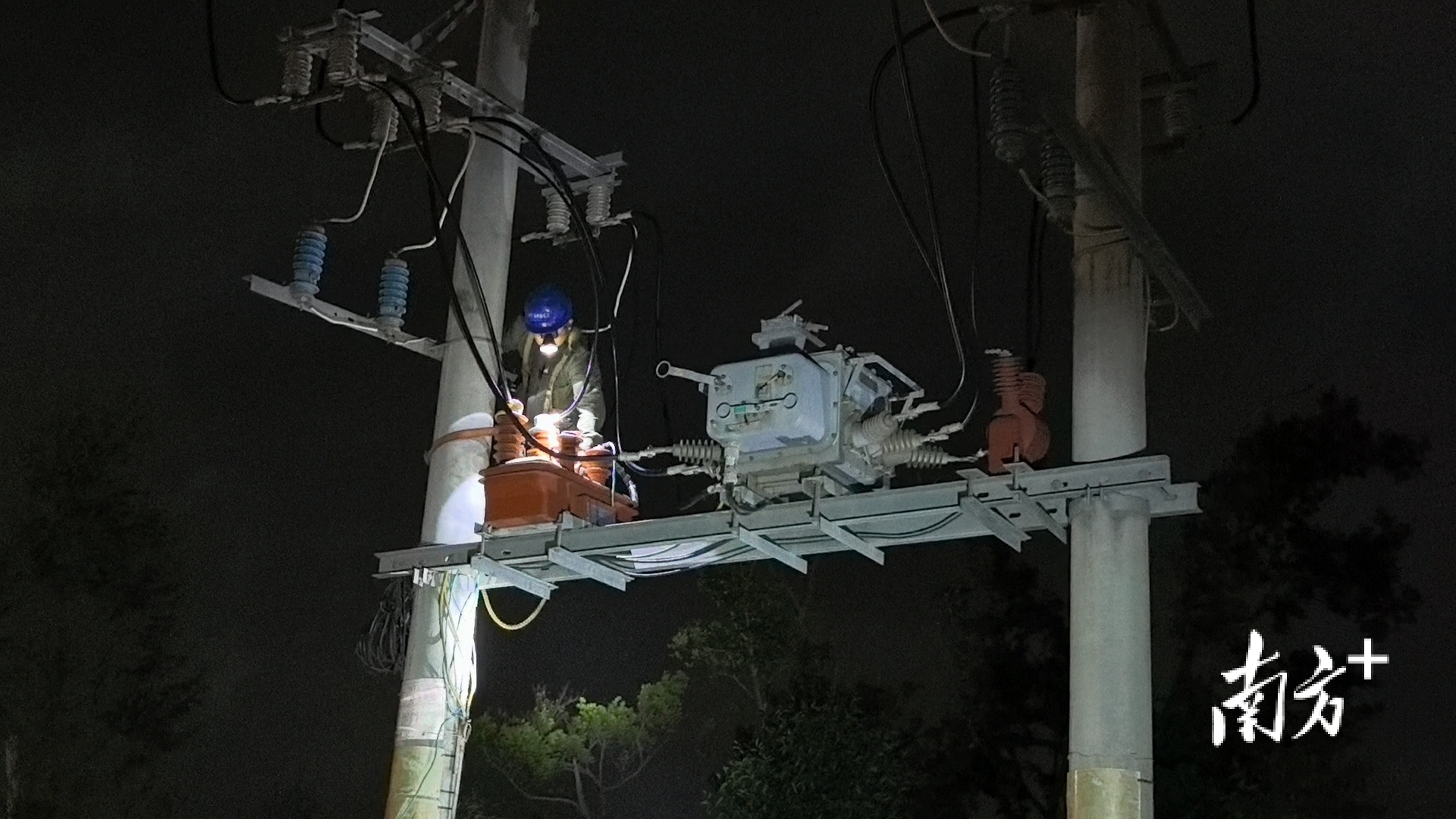 10月6日晚,河源连平供电局支援队伍在处理故障。曾睿 摄