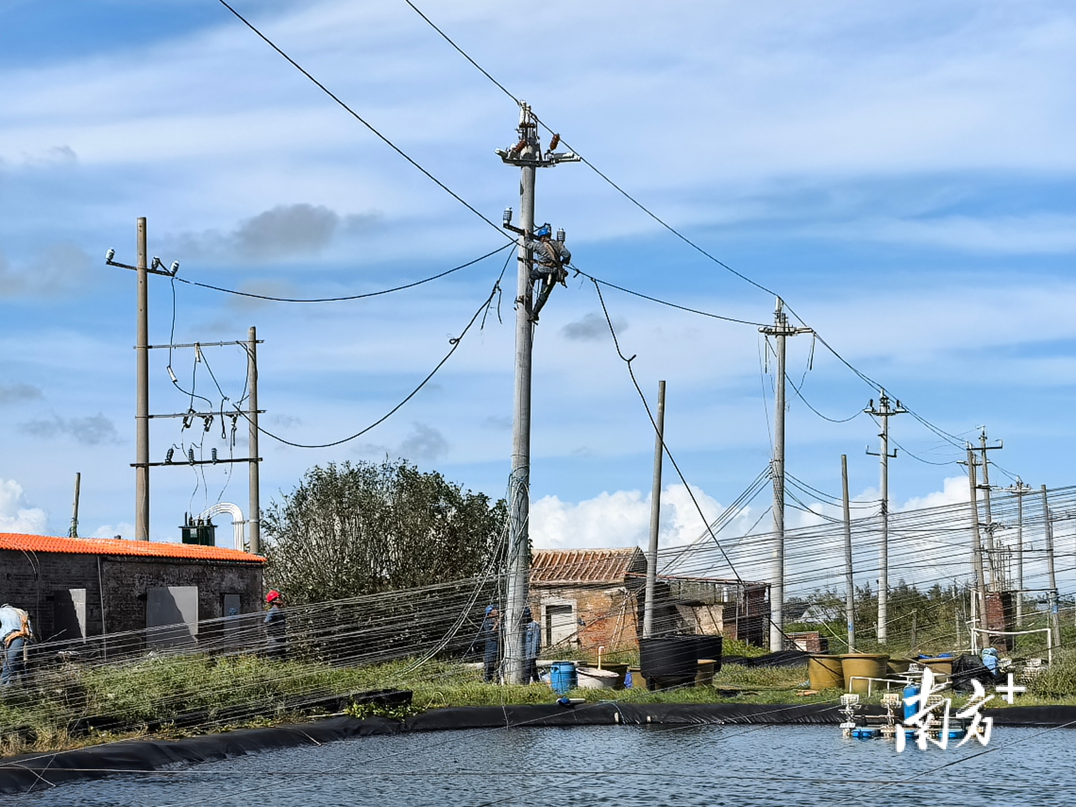 “电来了!增氧机转起来了!鱼有救了!”徐闻县前山镇养殖户激动地说。10月7日,在养殖基地,队员们发现由于台风刮倒了电线杆,导致主线电缆断裂。此时鱼塘自备发电机油料不多,养殖户焦虑不安。支援队员们踩着泥泞的田埂扛设备、架电缆,经过13个小时的紧急抢修,终于恢复了养殖区的供电。