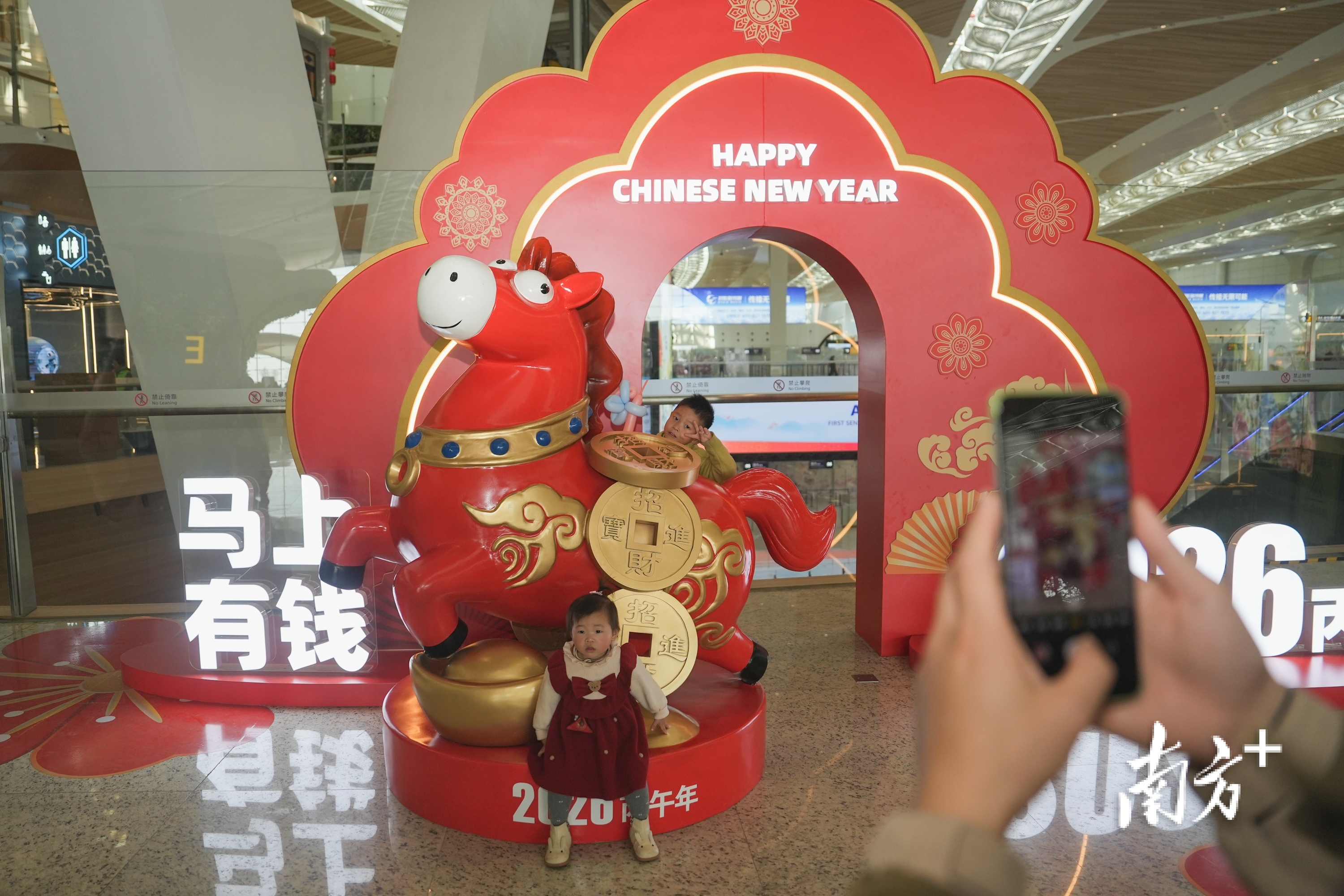 2月2日,春运首日的T3航站楼内,旅客们在新年主题的装置前合影留念。