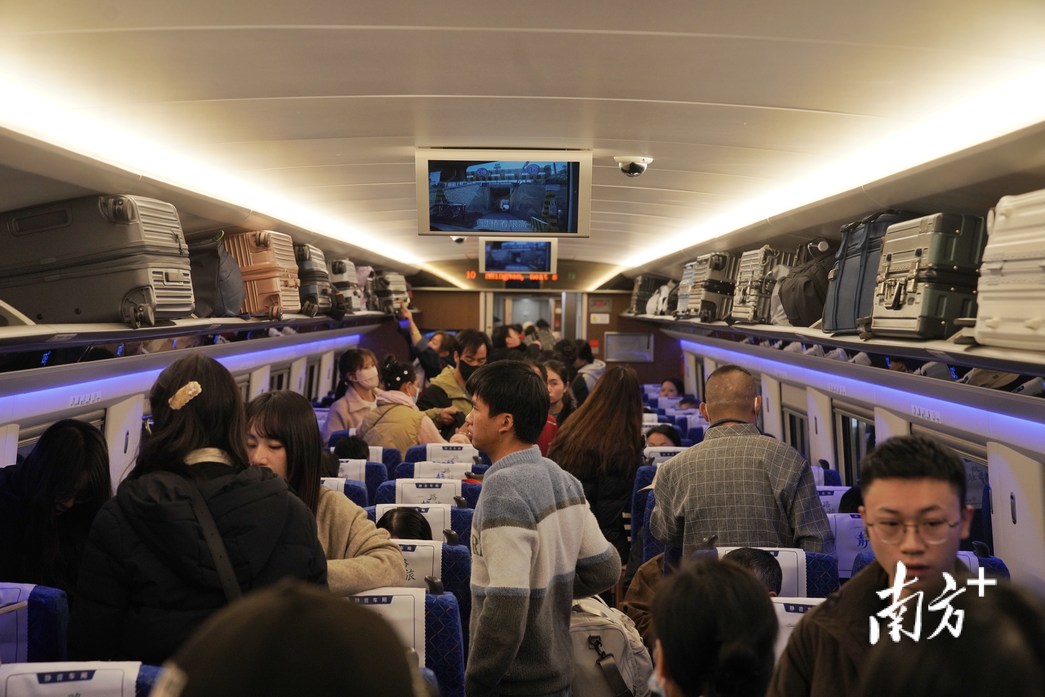 2月2日,广州南站,车厢内的行李架塞得满满当当,列车即将出发。