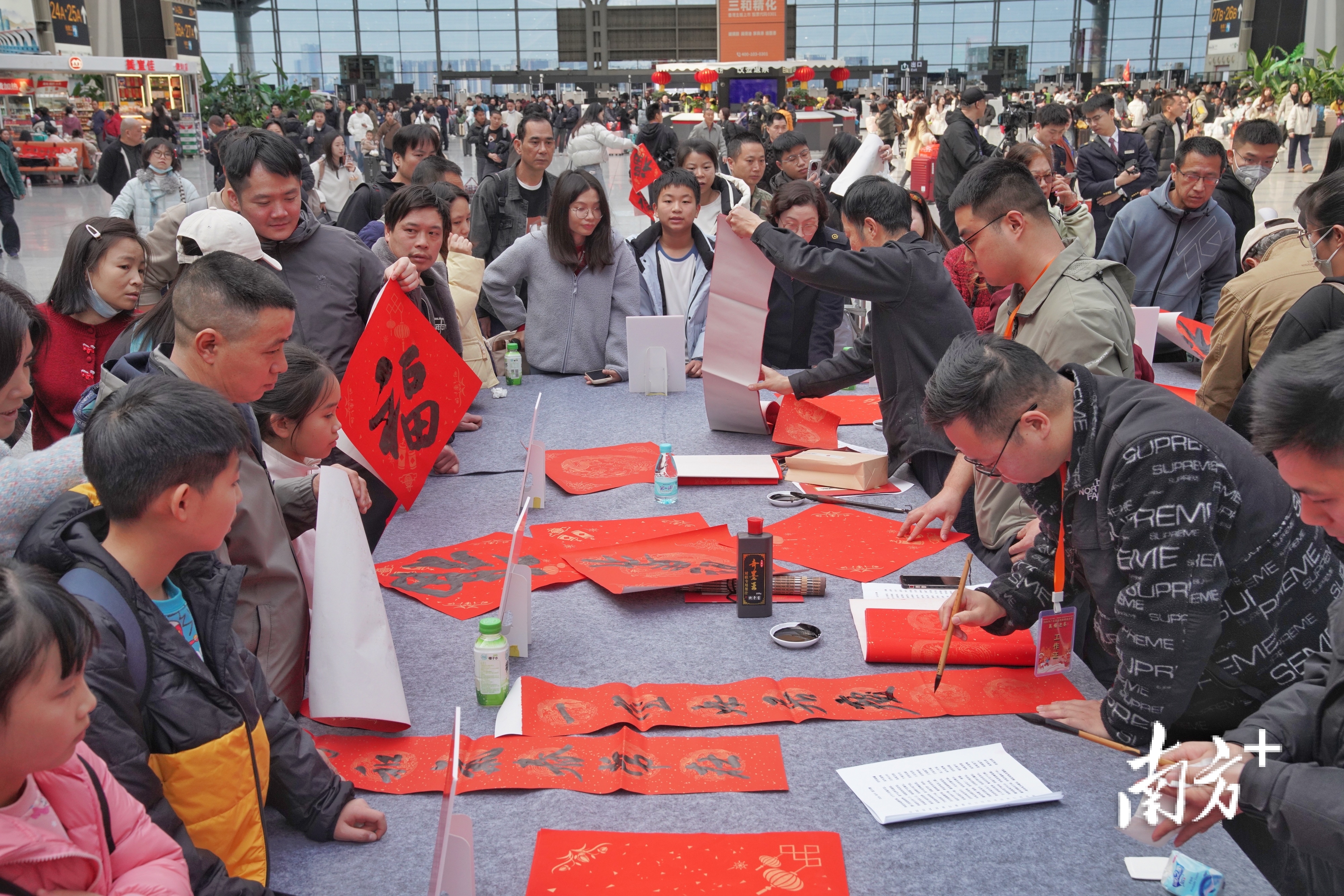 2月2日上午,广州南站候车大厅内,书法家为旅客挥春送福。