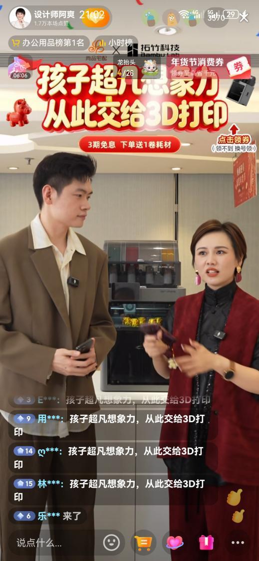 双方致力于共建中国家庭3D打印创客空间的愿景,传递深耕家庭场景的决心。依托设计师阿爽在家居设计领域的专业口碑、超高人气及千万粉丝基础,以及其自带的家居场景种草属性的影响力,直播实现了拓竹打印机及3D打印产品的高效转化,既验证了家庭3D打印市场的巨大潜力,也为双方合作的商业化落地奠定基础。此次直播更通过亲子互动场景,展现了拓竹科技在青少年STEM教育领域的应用价值,进一步强化了合作的社会意义。