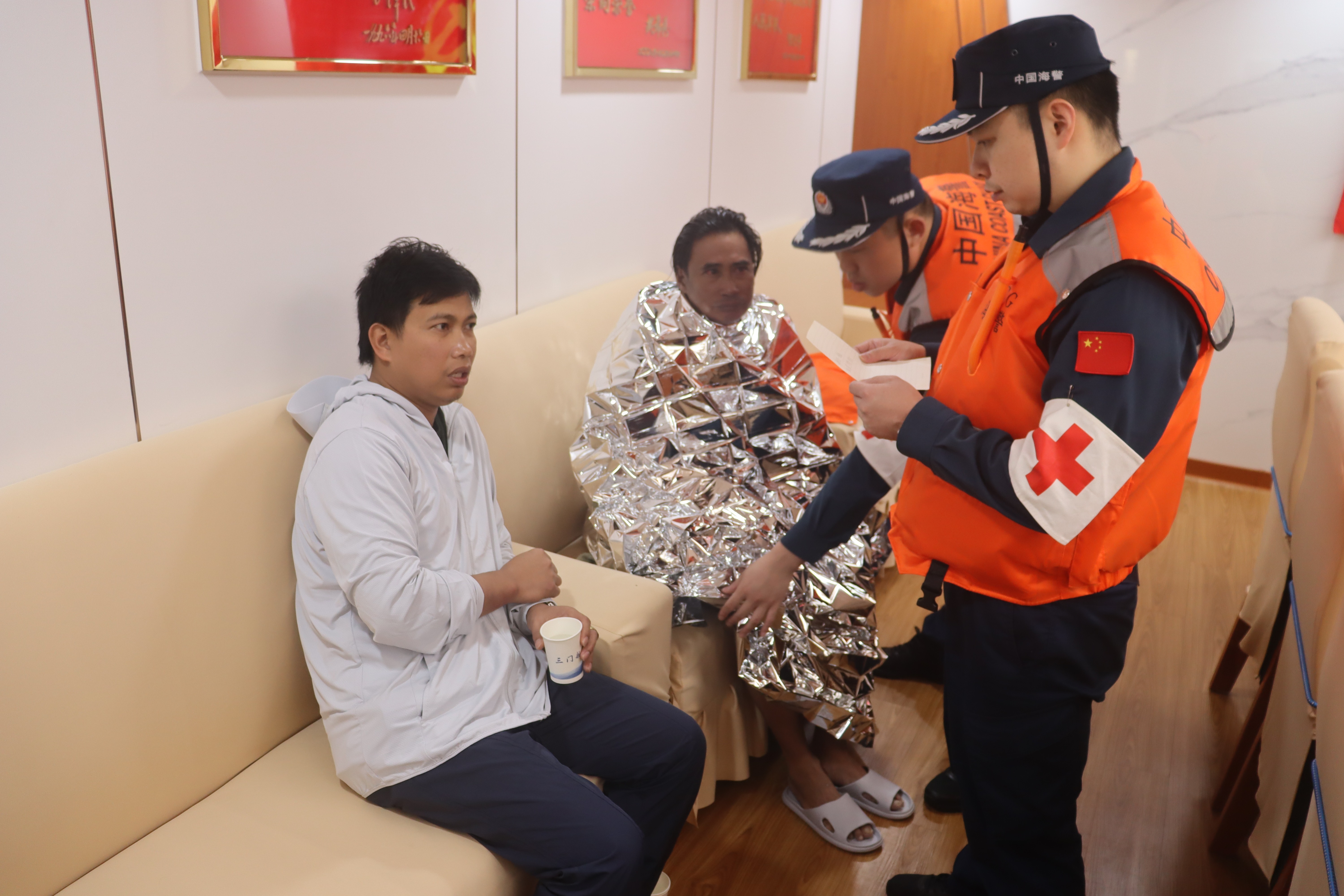 船员登舰后,海警医护人员第一时间为获救船员提供保暖、补水和心理治疗。针对呛水、擦伤、脱水等状况,开展呼吸道清理、伤口消毒包扎、生命体征监测等专业处置。对身体虚弱者安排专人陪护,实时观察状态。