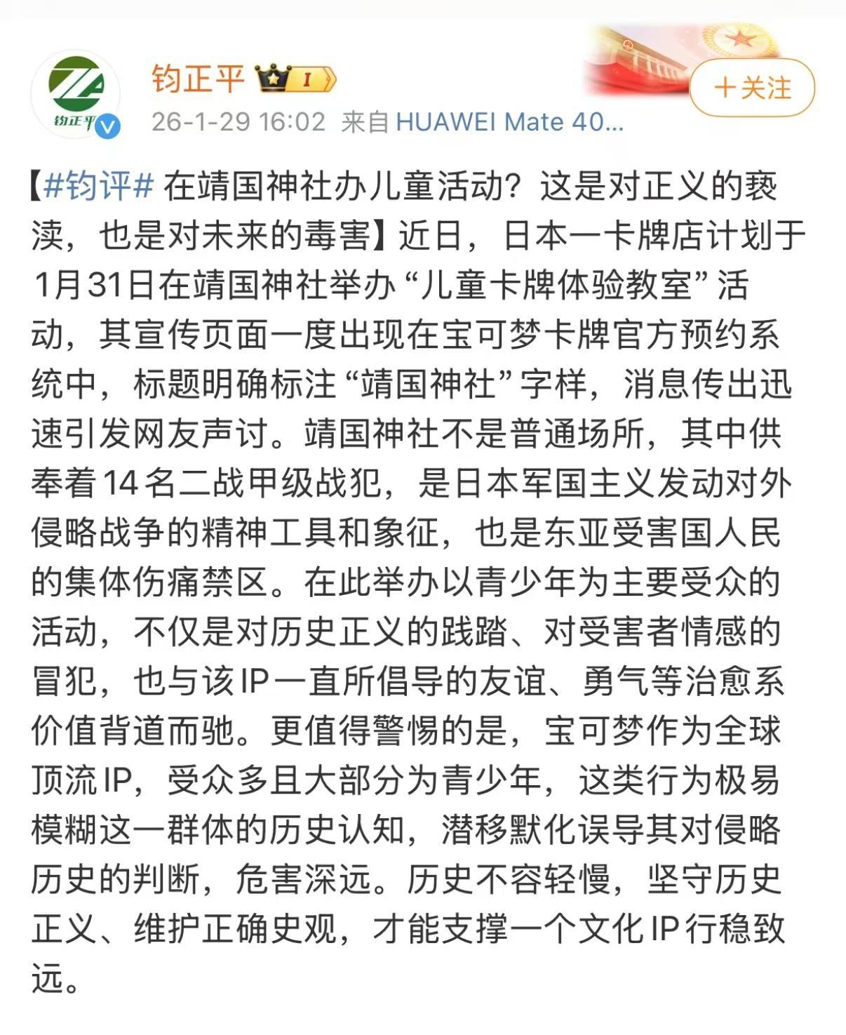 1月29日,钧正平工作室官方微博发文《在靖国神社办儿童活动?这是对正义的亵渎,也是对未来的毒害》。