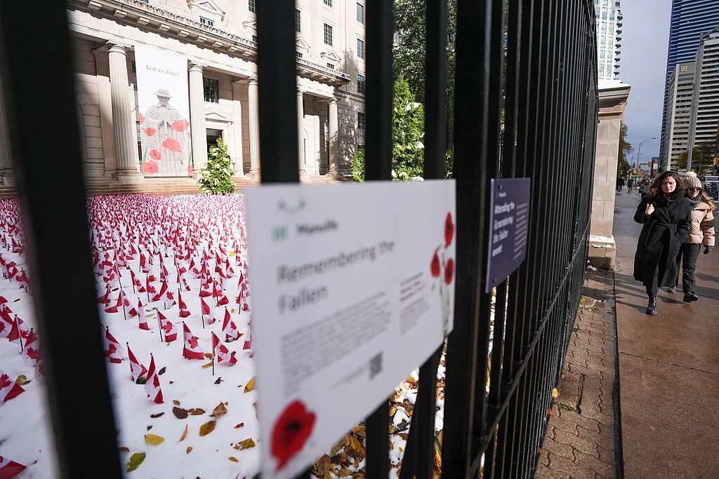 当地时间2025年11月11日,加拿大多伦多,宏利金融大厦外插满了加拿大国旗,以纪念逝世的退伍军人。据悉,这是加拿大年度退伍军人周活动的一部分。图/视觉中国