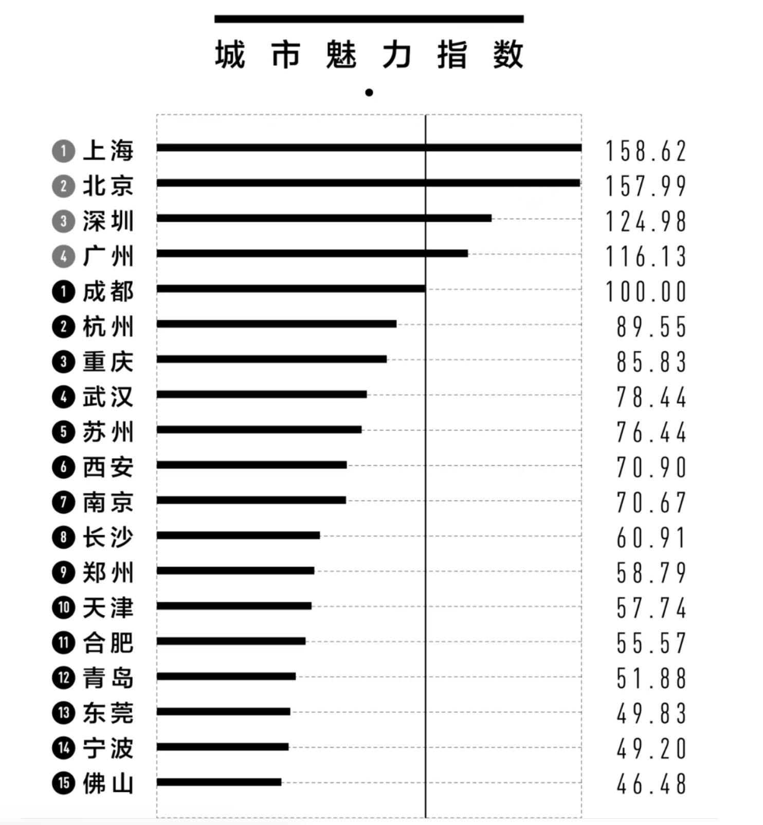 根据上述指标体系,上海、北京、深圳、广州稳居一线城市行列。而佛山则与成都、杭州、重庆等其他14座城市一并跻身新一线城市行列,排名第15位。