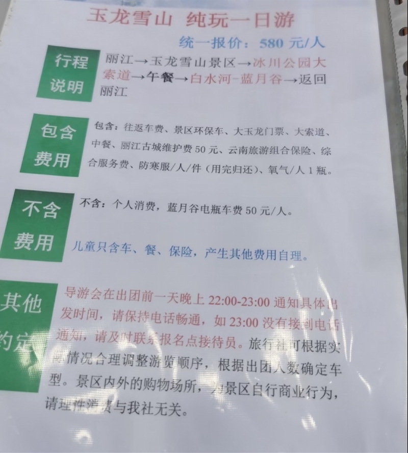 旅客提供的当地旅行社一日游费用明细。来自北京的游客吕晴(化名)向南都记者表示,她曾于2021年前往丽江古城旅游,当时并未跟团,在酒店登记信息时就被告知需要缴纳维护费。“丽江古城是没有围墙的,散客如果不买票确实也可以进入。但我们当时没有缴纳维护费,就不让我们买玉龙雪山的门票。”