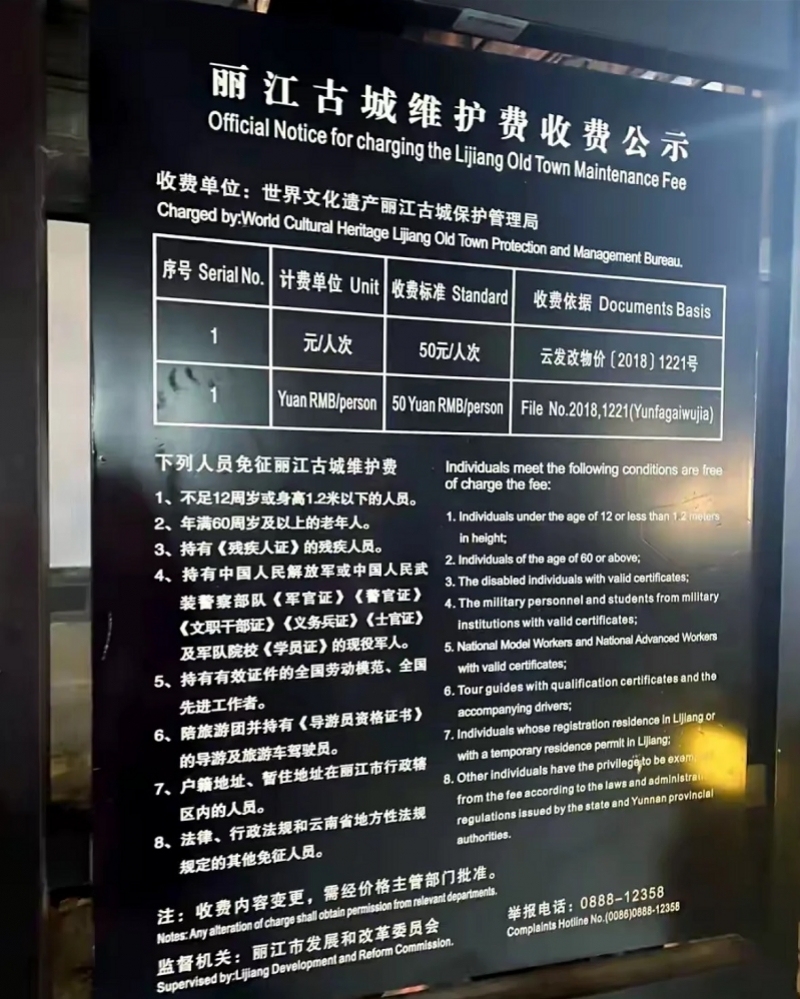 丽江古城维护费收费公示。新规明确丽江古城维护费一年内有效