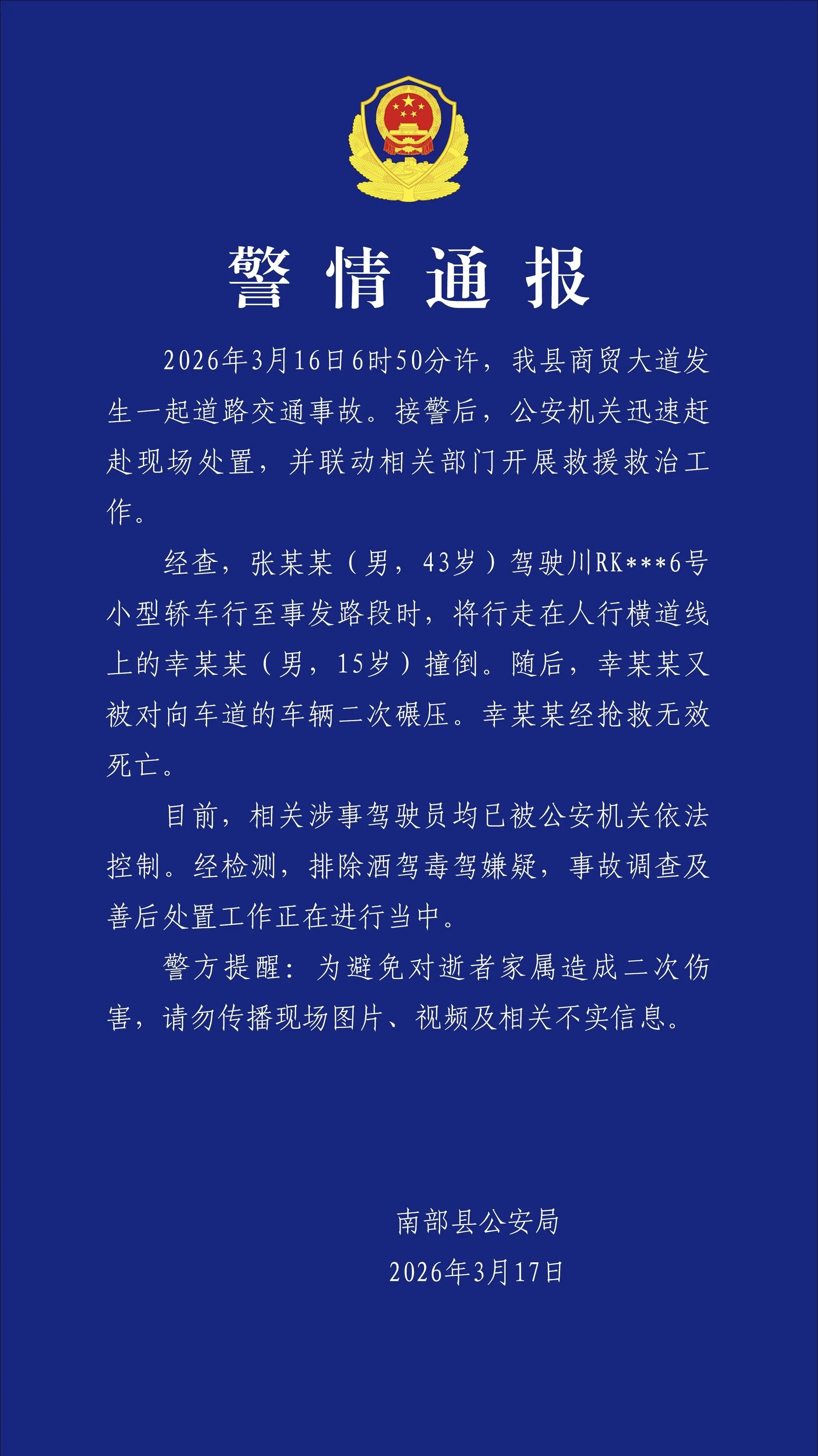 3月17日,四川省南部县公安局发布警情通报,介绍了3月16日该县商贸大道发生的一起道路交通事故相关情况。