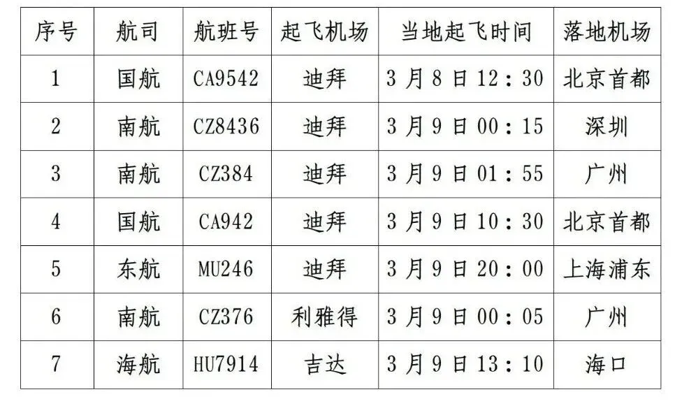 据了解,以下航班尚有余票。外交部领事保护中心建议,滞留中东地区的中国旅客抓紧时间通过以下航班回国,可登录各航空公司微信服务号或小程序购票。