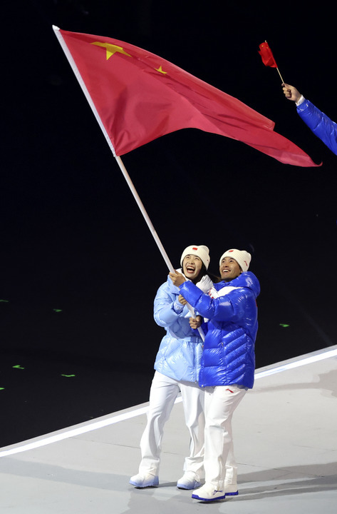 2月6日,中国代表团旗手宁忠岩(右)、张楚桐在开幕式上入场。
